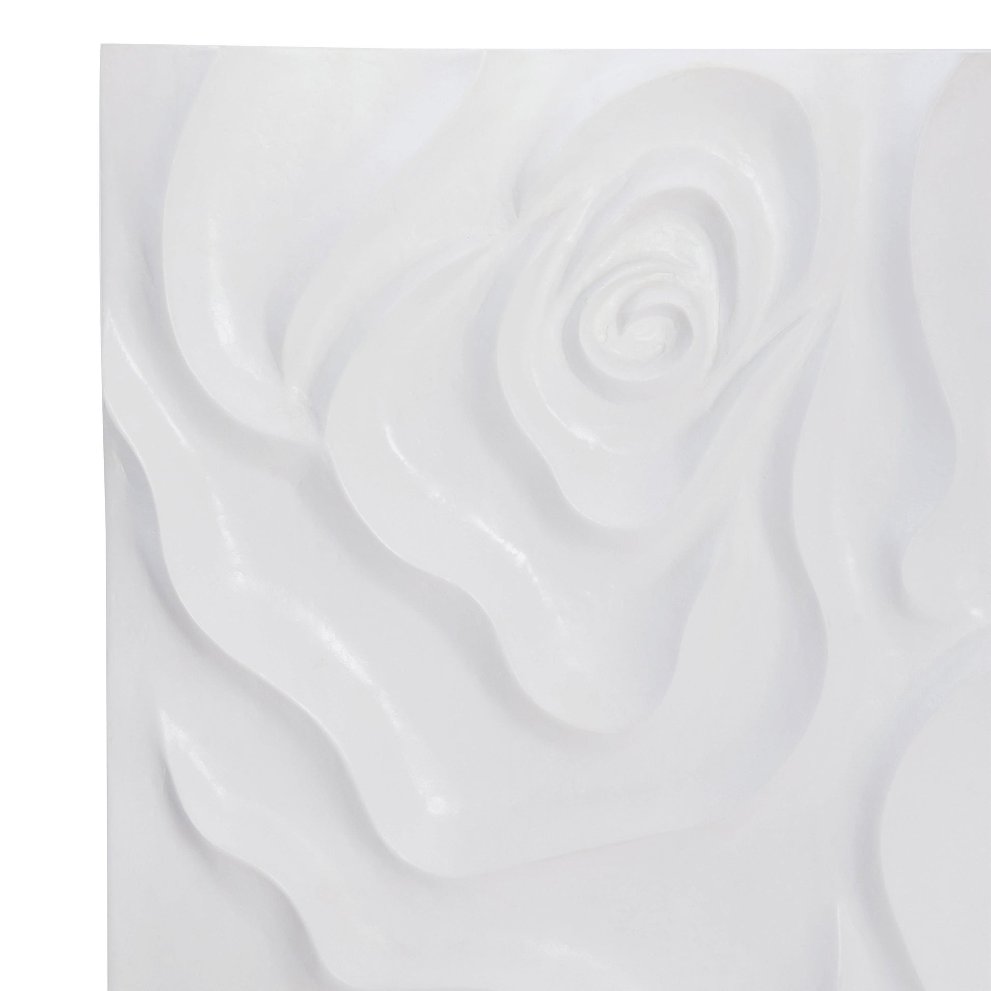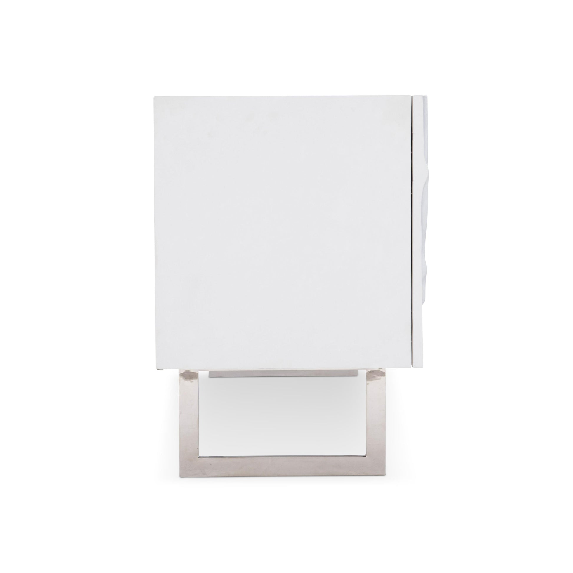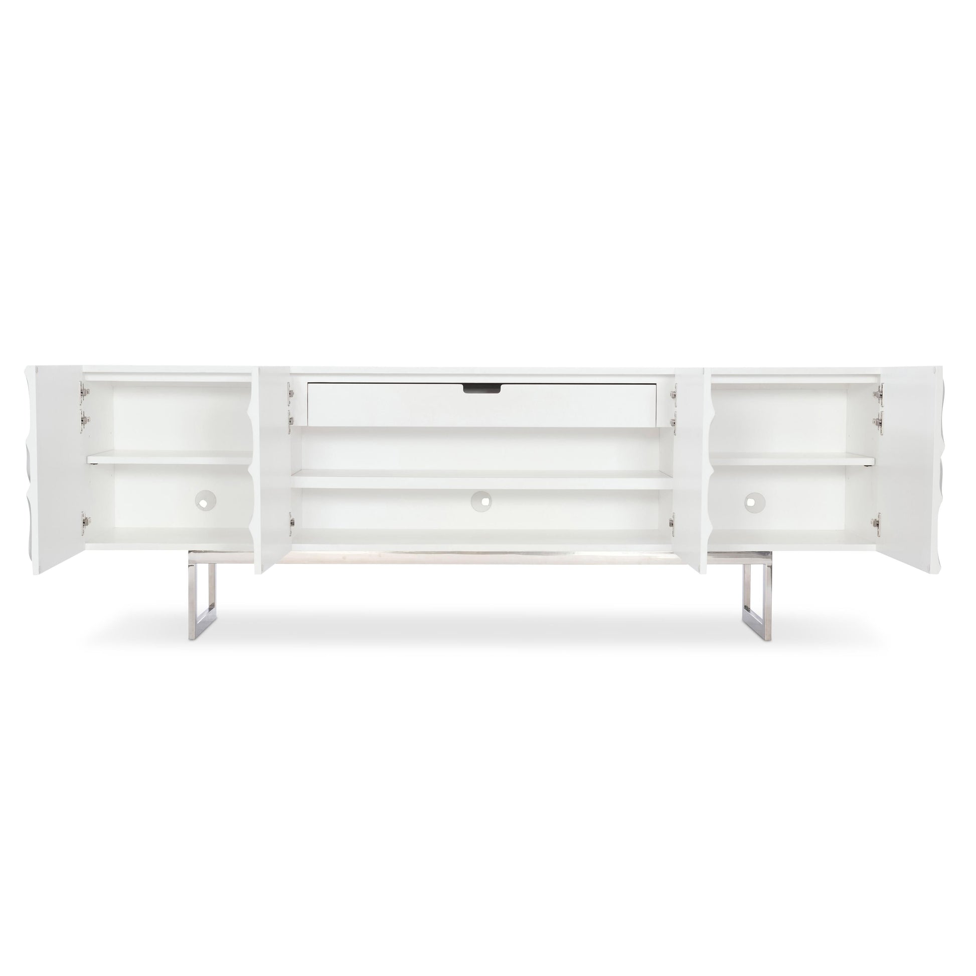 The Penrose Entertainment Credenza delivers a refined modern presence through its sculptural floral motif, delicately carved across the door fronts. Finished in crisp white plaster, the surface feels bright and architectural, while graceful swirls add depth and visual movement. A polished stainless steel base anchors the design with sleek, contemporary lines that elevate the piece above the floor for a light, sophisticated profile.