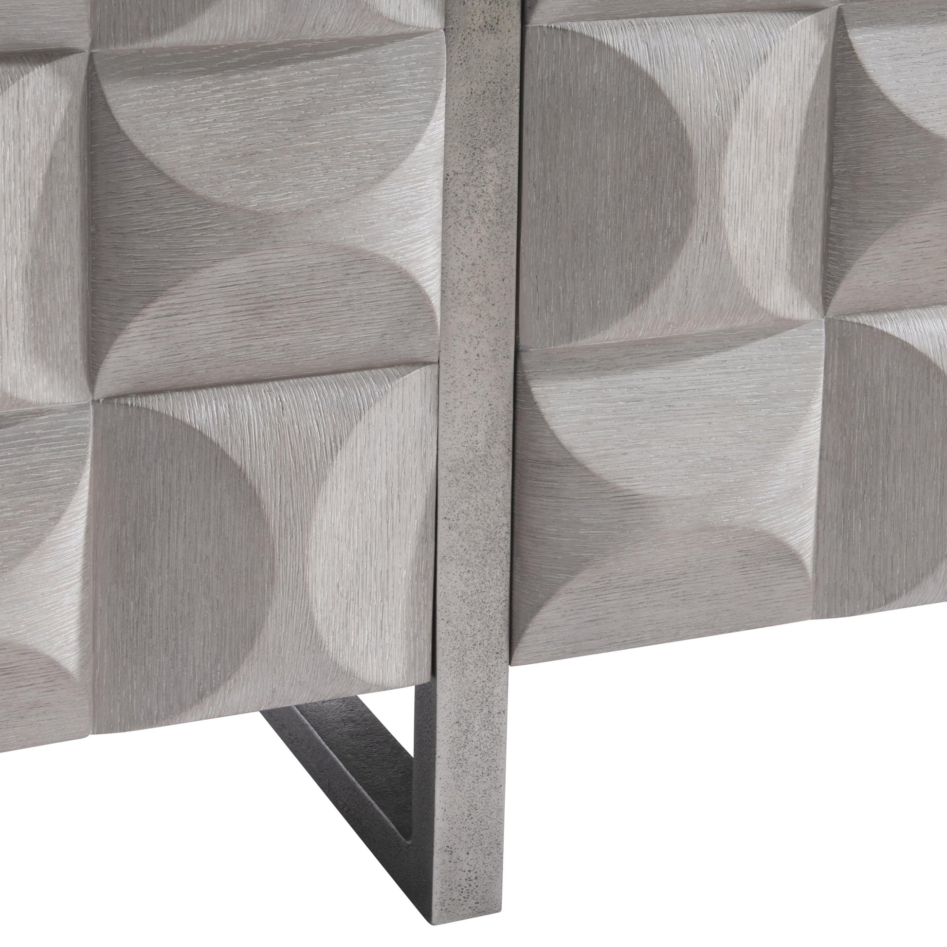 The Rune Entertainment Credenza delivers bold visual impact through sculptural form and richly layered materials. Its façade is defined by deeply dimensional door fronts, where carved half-circle motifs in cast resin introduce depth and rhythm while echoing a refined wood grain pattern. Finished in Bluff over white oak veneers, the case brings warmth and natural character, contrasted by the architectural presence of open cast aluminum legs in a Graphite finish that wrap around the silhouette and intersect the doors and top.