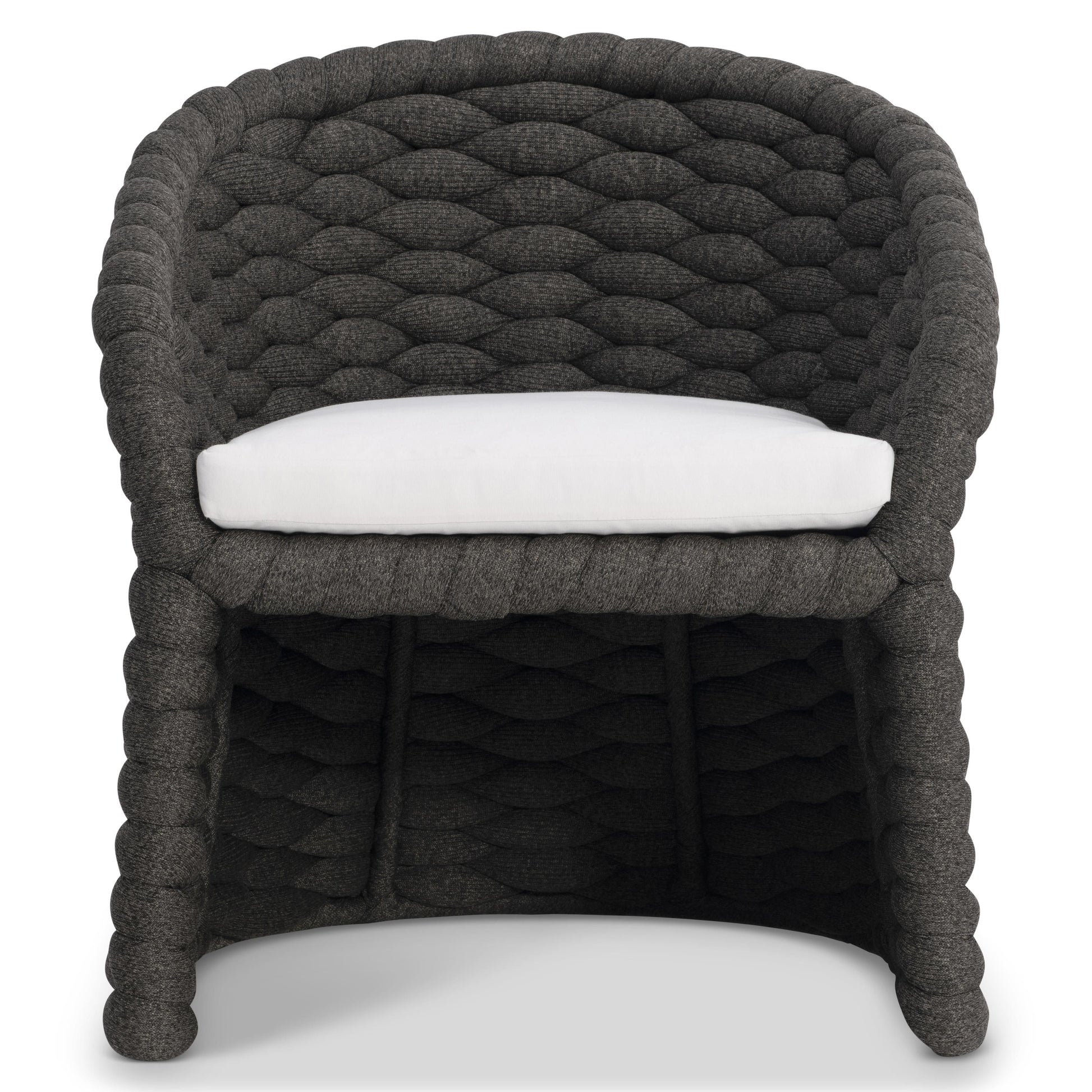 The Salinas Arm Chair brings sculptural elegance to outdoor living with a distinctive, tactile presence. Its curvaceous aluminum frame is wrapped in a soft-knit sock weave, creating a layered, woven texture that feels both modern and inviting. Finished in a rich Dark Umber tone, the design delivers visual depth while maintaining a relaxed, contemporary character.