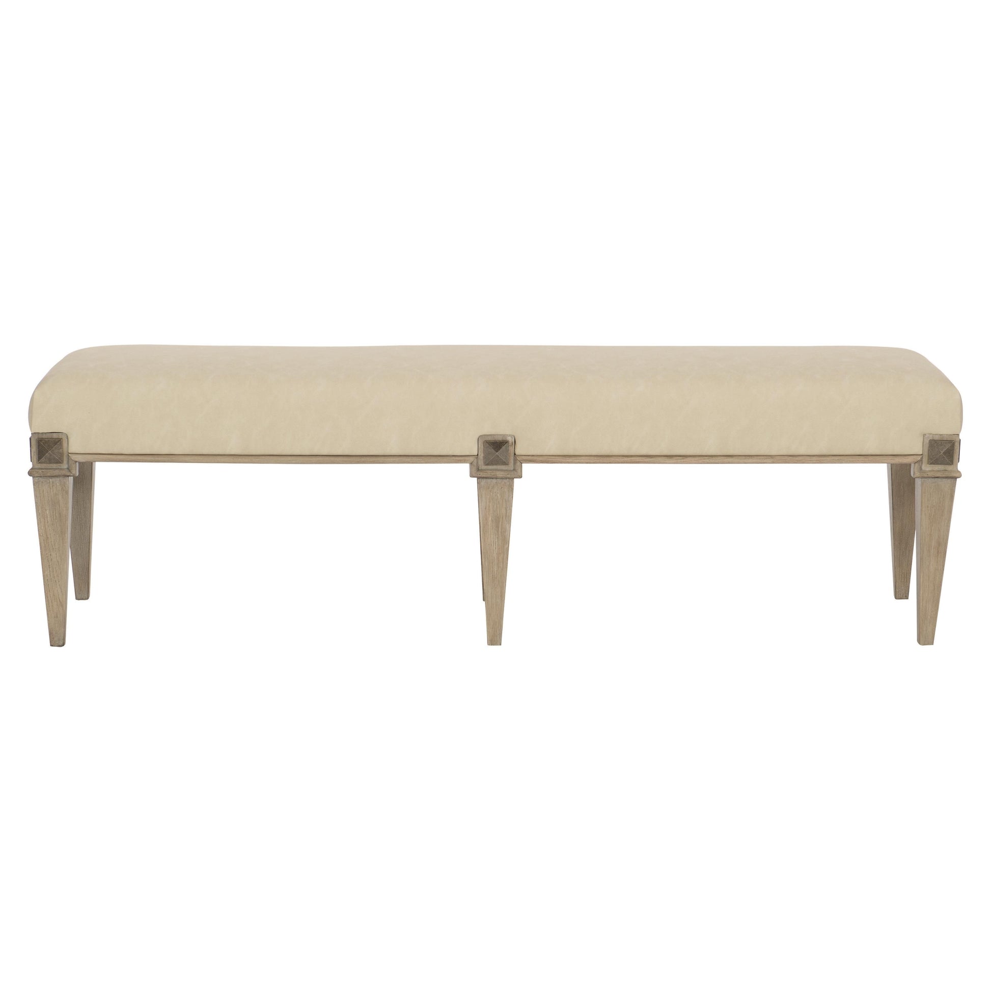 Six tapered wood legs ground the design, showcasing wire-brushed, cerused oak veneers in a warm Sandstone finish. Each leg is adorned with a square, faceted metal medallion in a tinted Vintage Nickel tone, lending a subtle aged character. The thoughtful combination of textures and finishes gives this bench a polished yet approachable presence, ideal at the foot of a bed, along a dining table, or in an entryway.