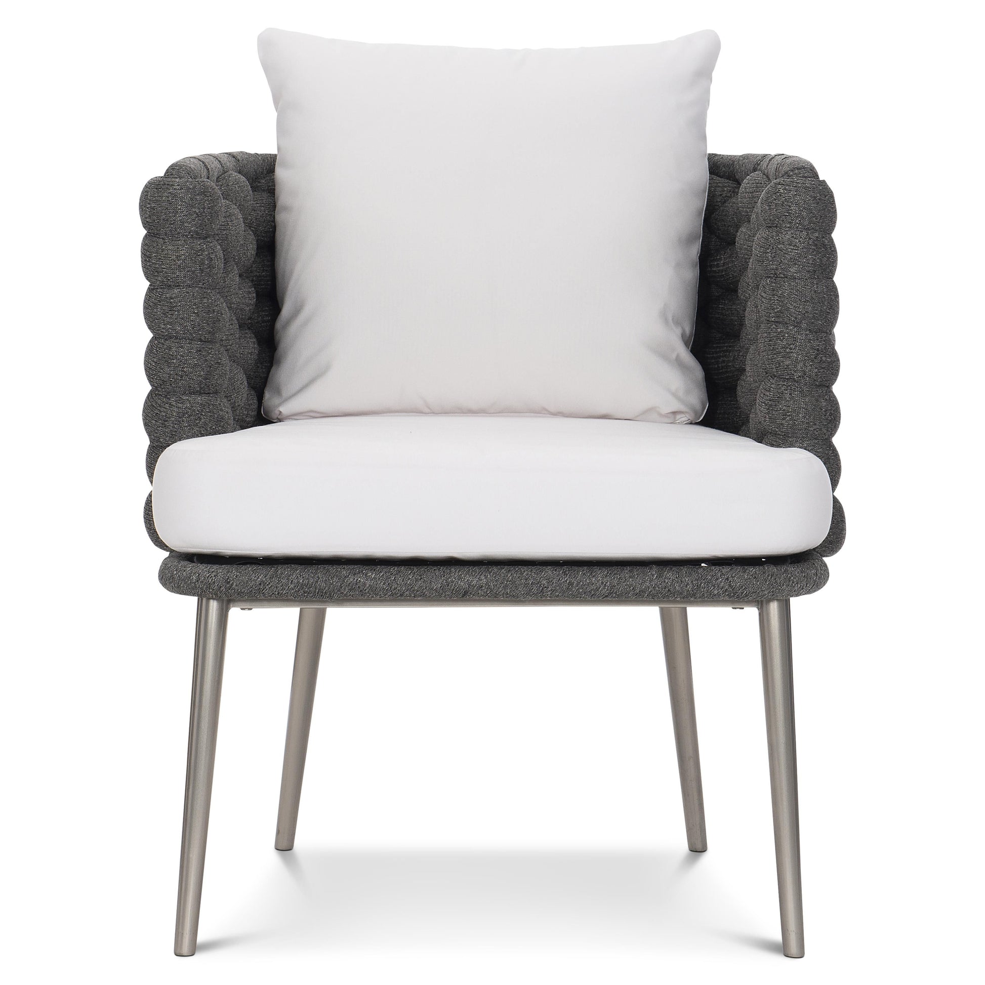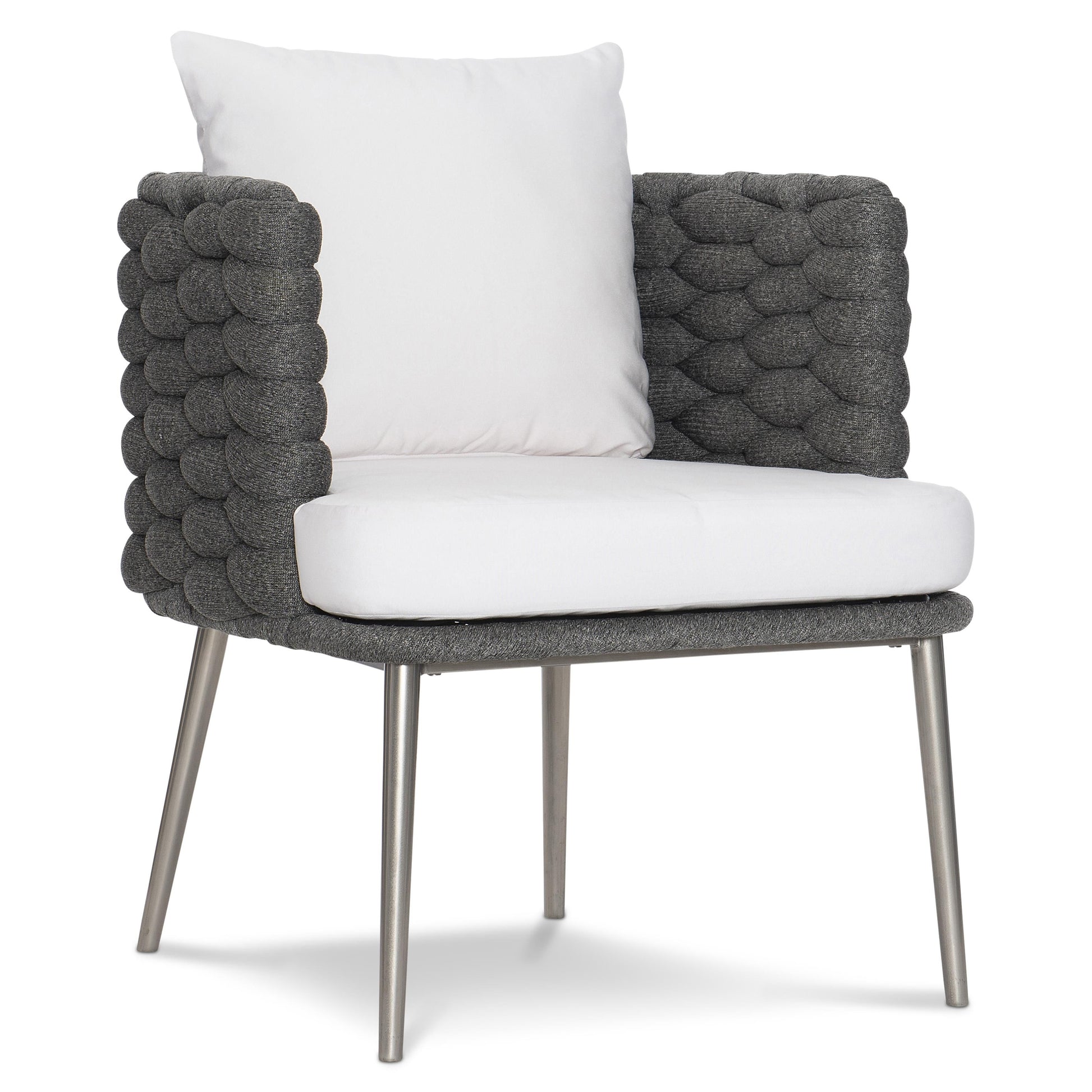 The seat is grounded by delicately splayed, tapered legs finished in Silver Mist, lending visual lightness while maintaining strength and stability. A plush reticulated foam cushion and supportive back pillow enhance comfort, making this outdoor arm chair as welcoming as it is visually striking. Thoughtful details like adjustable glides ensure ease of placement across different surfaces.