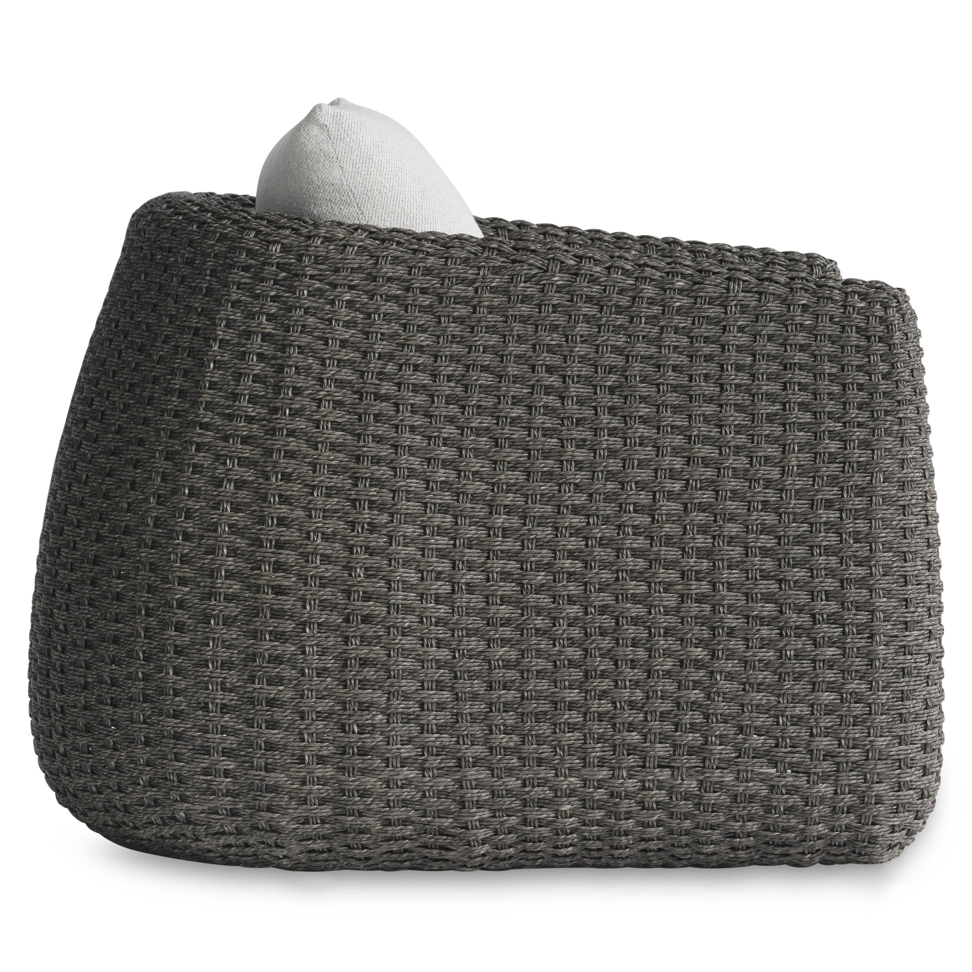 The Sarene Outdoor Swivel Chair brings sculptural softness to outdoor living through its generously rounded silhouette and inviting proportions. An all-weather woven frame in a Dark Thatch finish creates visual depth, while gently arcing shelter arms wrap around the seat for a relaxed yet refined presence. The woven texture and modern profile make the chair a distinctive accent for patios, terraces, and outdoor lounge settings.