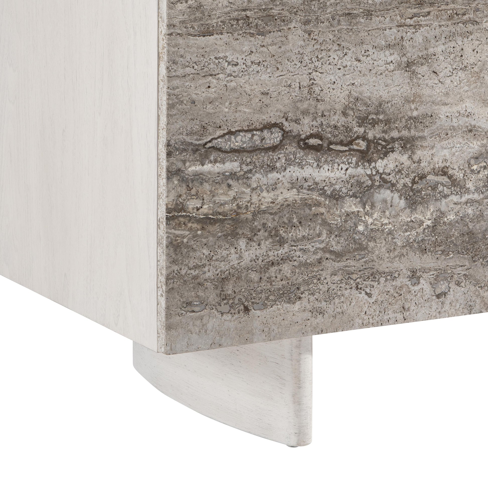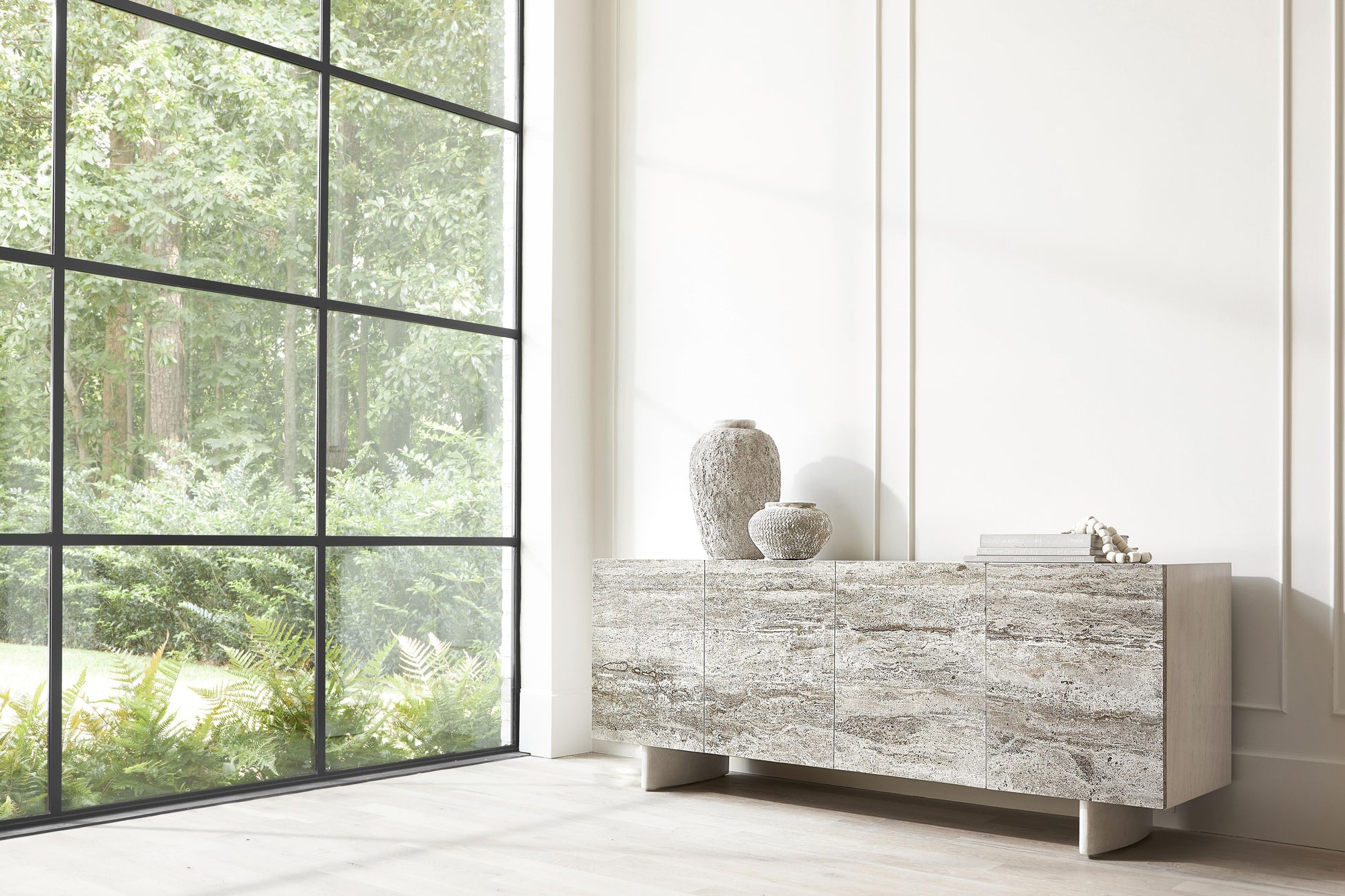 Thoughtful detailing elevates the design, from the push-to-open doors to the cast resin legs finished in a Lutra faux stone texture. Inside, the Sereno credenza is carefully configured to support media and entertainment needs, offering shelves, a drawer, ventilation, and discreet grommet access. The result is a striking yet highly functional statement piece designed to anchor contemporary living spaces.