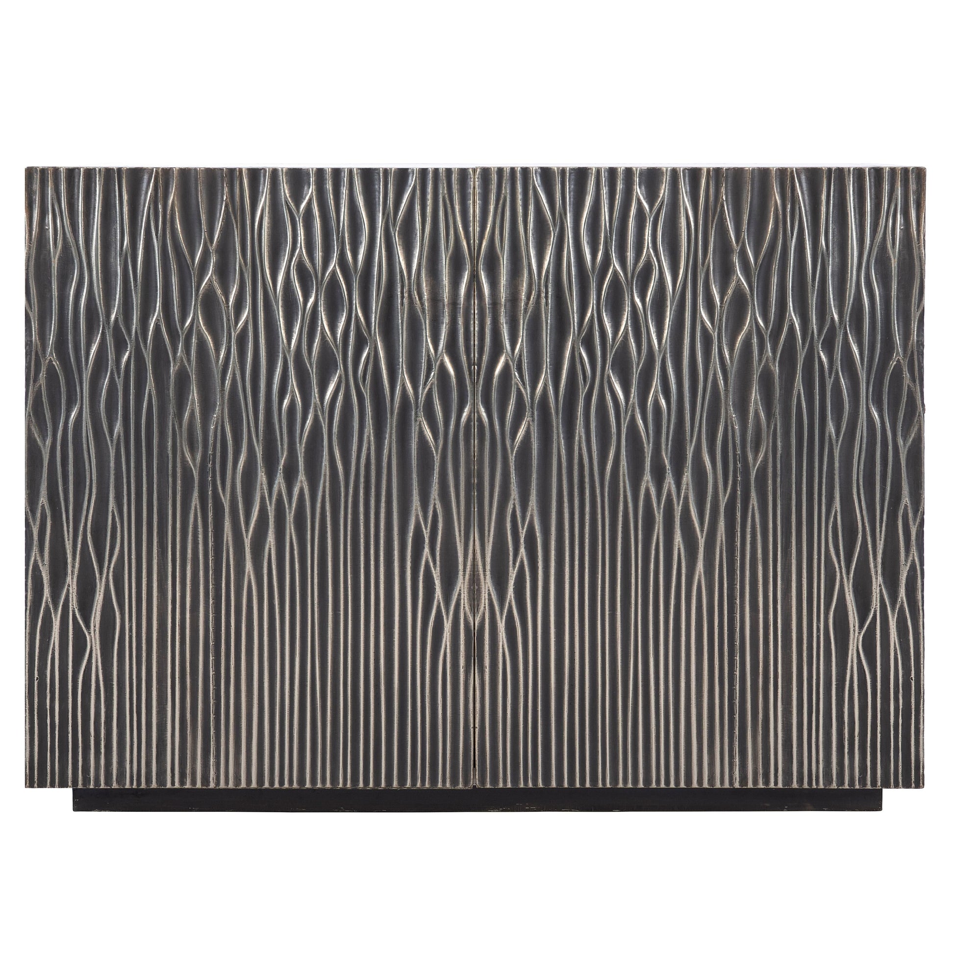 The Skylar door chest makes a striking impression with its sculptural presence and luminous finish. Wrapped in German silver, the mango wood case is adorned with an elegant pattern of flowing lines that creates depth, movement, and a refined sense of texture. An antique silver finish enhances the design with subtle vintage glamour, giving the piece a distinctive modern allure.