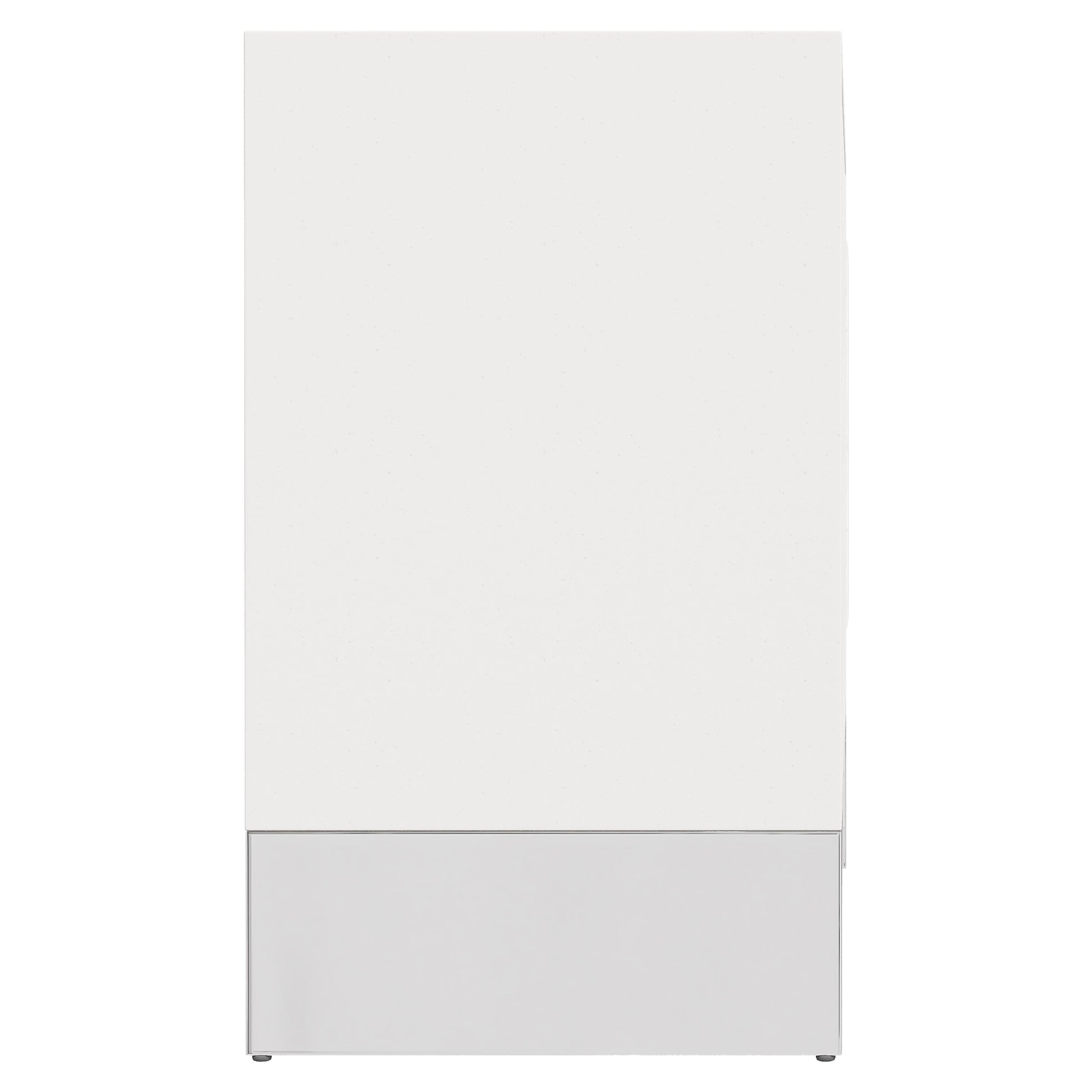 - Soft-close drawer with hand-pull cutout beneath a fixed shelf