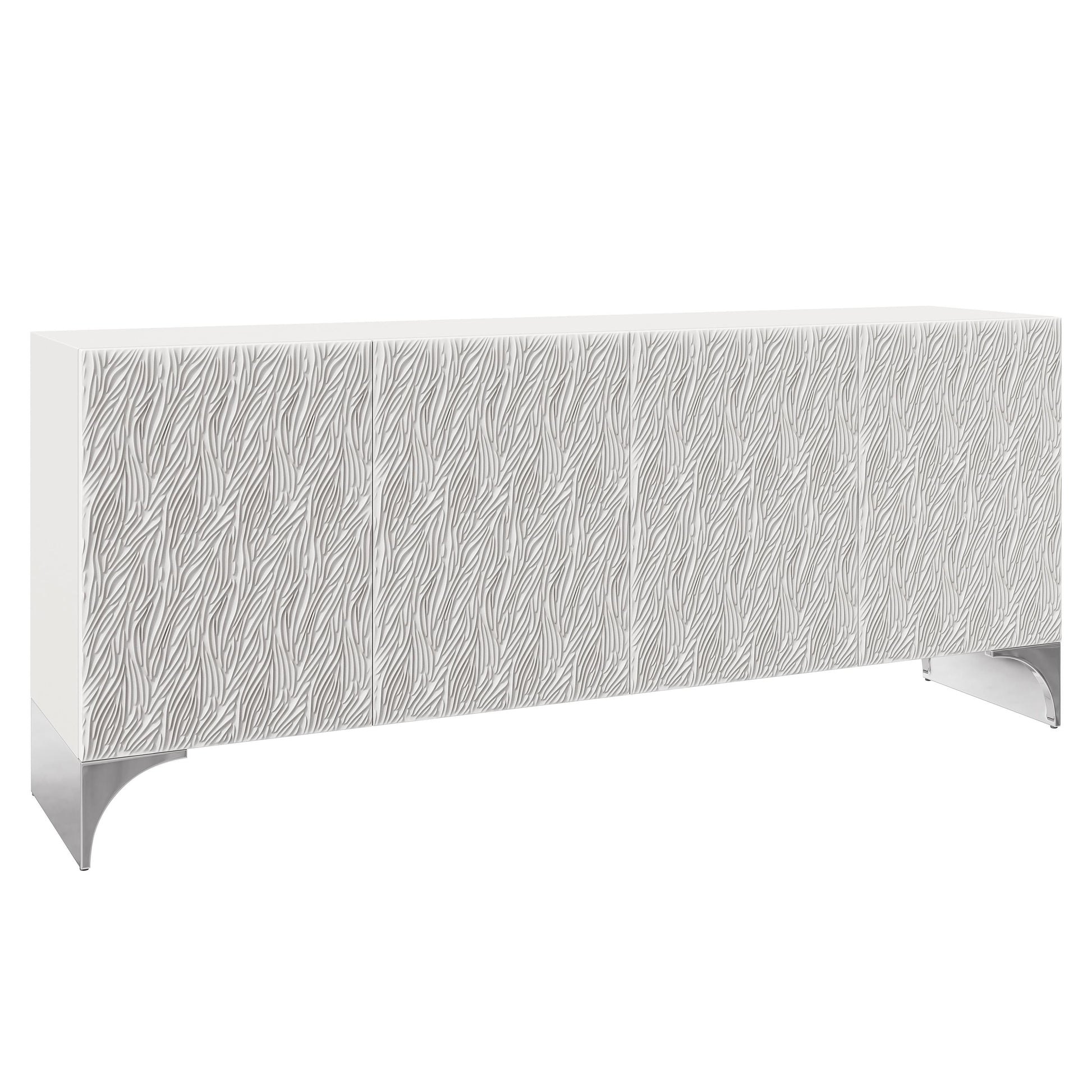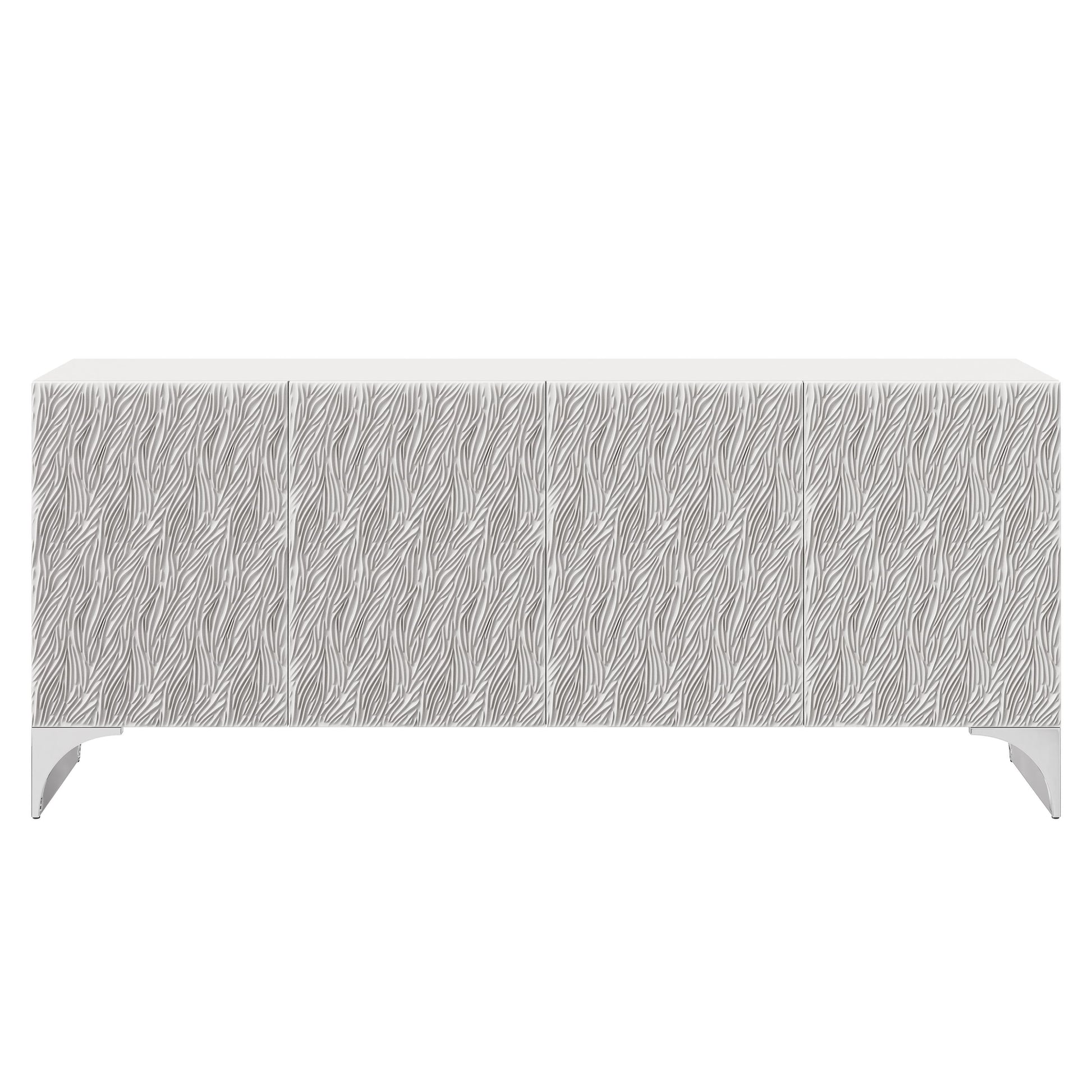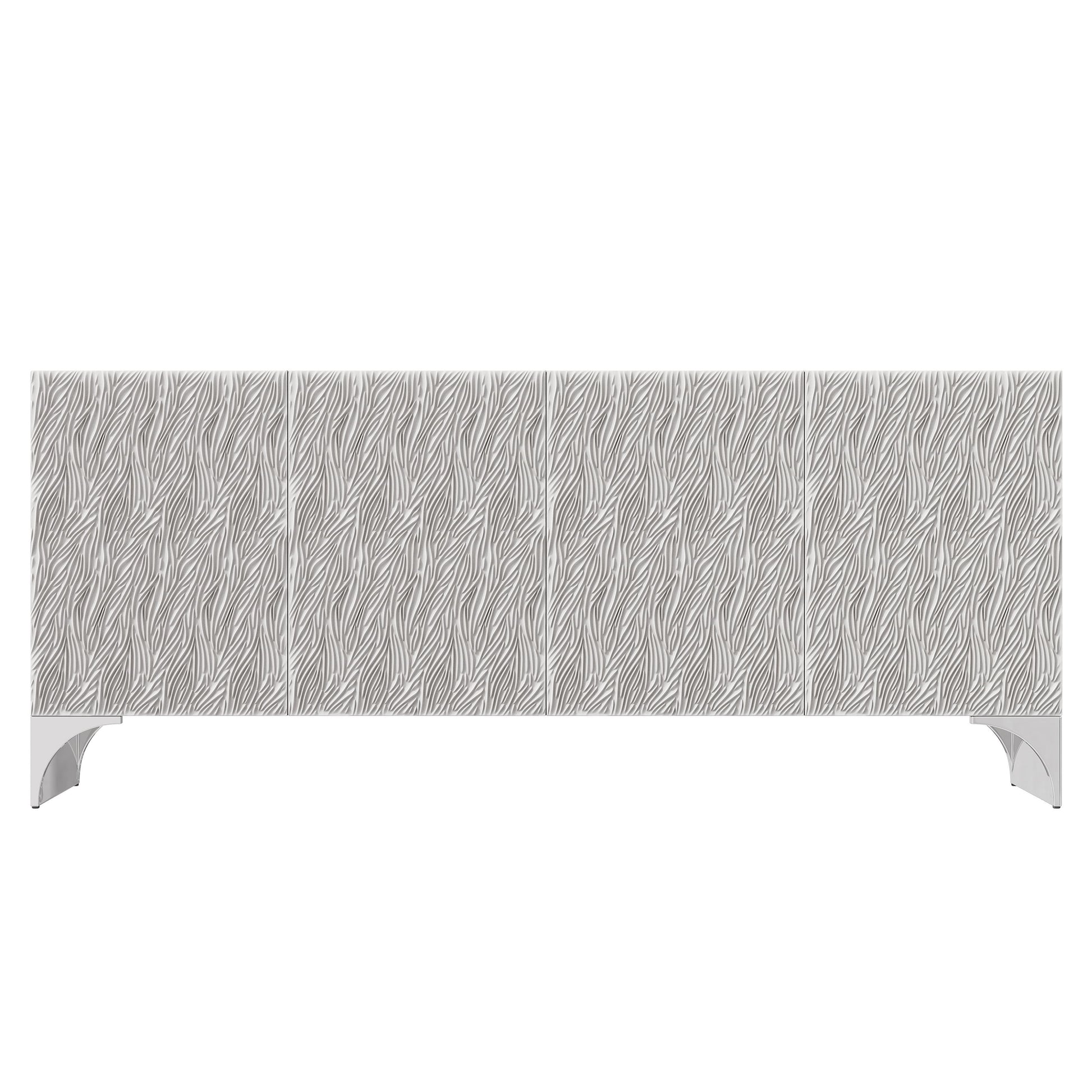 The Stratum entertainment credenza delivers a striking balance of modern artistry and architectural presence. Sculpted cast resin door fronts introduce a rhythmic pattern inspired by the movement of wheat fields, bringing depth and visual motion to the facade. The Fossil white faux stone finish across the top and sides enhances the credenza’s refined, monochromatic palette, while polished nickel steel base panels add a crisp, contemporary contrast.