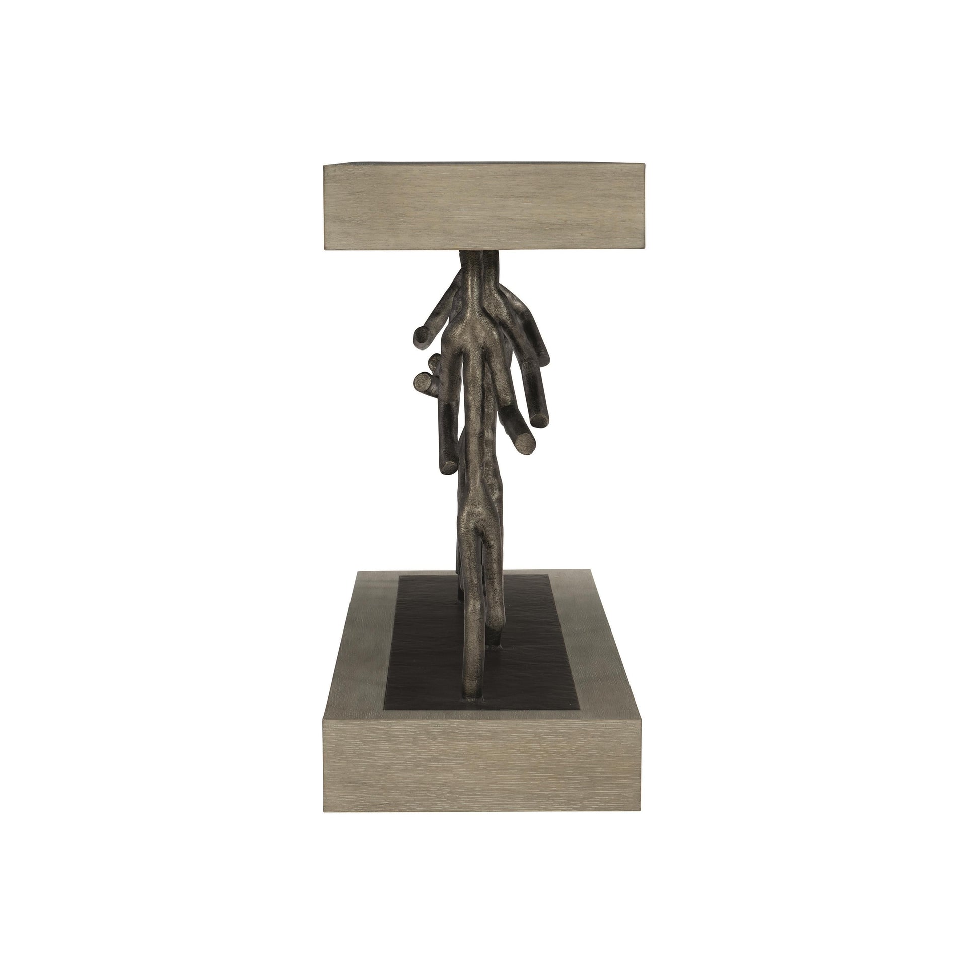 Wire-brushed quartered white oak veneers form the top and base, revealing subtle texture beneath a cerused greige finish. This soft, nuanced tone contrasts beautifully with the black cast iron figures, whose faux bois character adds depth and visual intrigue. The result is an accent console table that feels curated and artistic, equally suited to contemporary interiors and collected spaces.