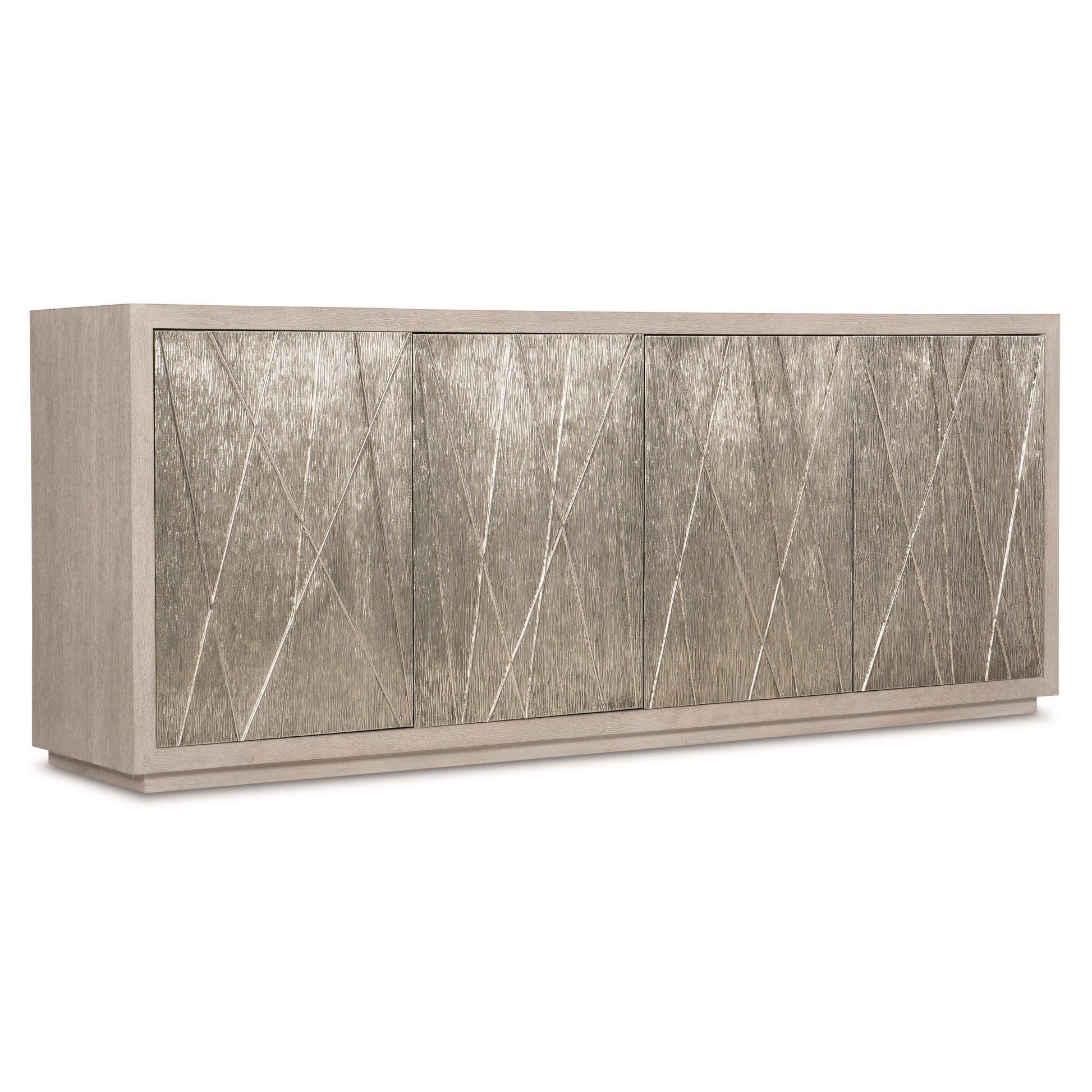 The Valora entertainment credenza presents a refined expression of modern design informed by Art Deco influences. Clean geometry and smooth architectural lines are elevated by cast aluminum overlays that introduce a radiant, tactile surface across the four doors. The textured metal shimmers in a graphite finish, creating visual depth and a sophisticated contrast against the warm wood tones.