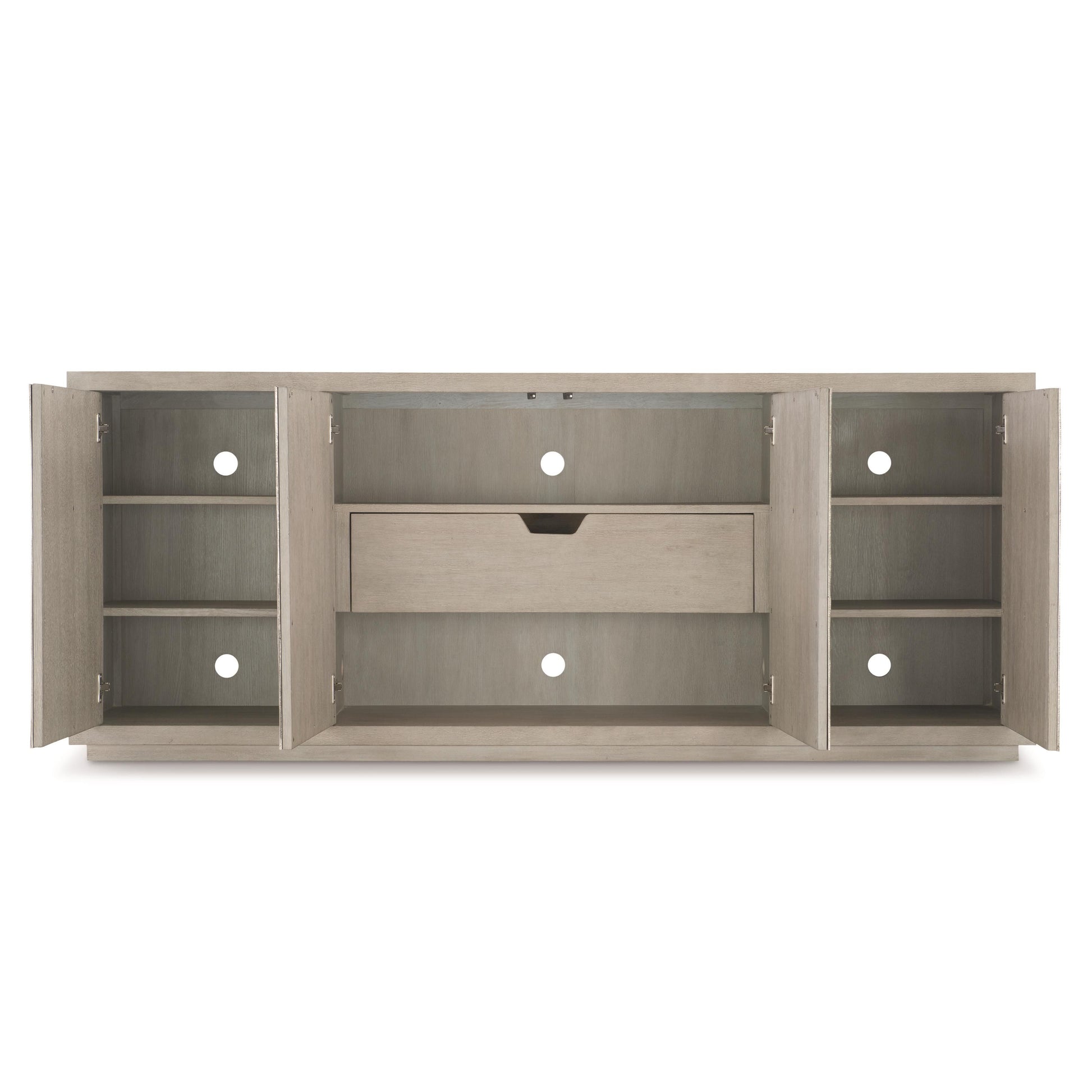Sandblasted oak veneers in a Weathered Greige finish soften the overall look while enhancing the credenza’s contemporary character. Designed for both statement and performance, the interior offers a thoughtful balance of open and concealed storage, making it well suited for media components or curated display. A streamlined plinth base and discreet push-to-open doors maintain the sleek profile while allowing the materials to take center stage.