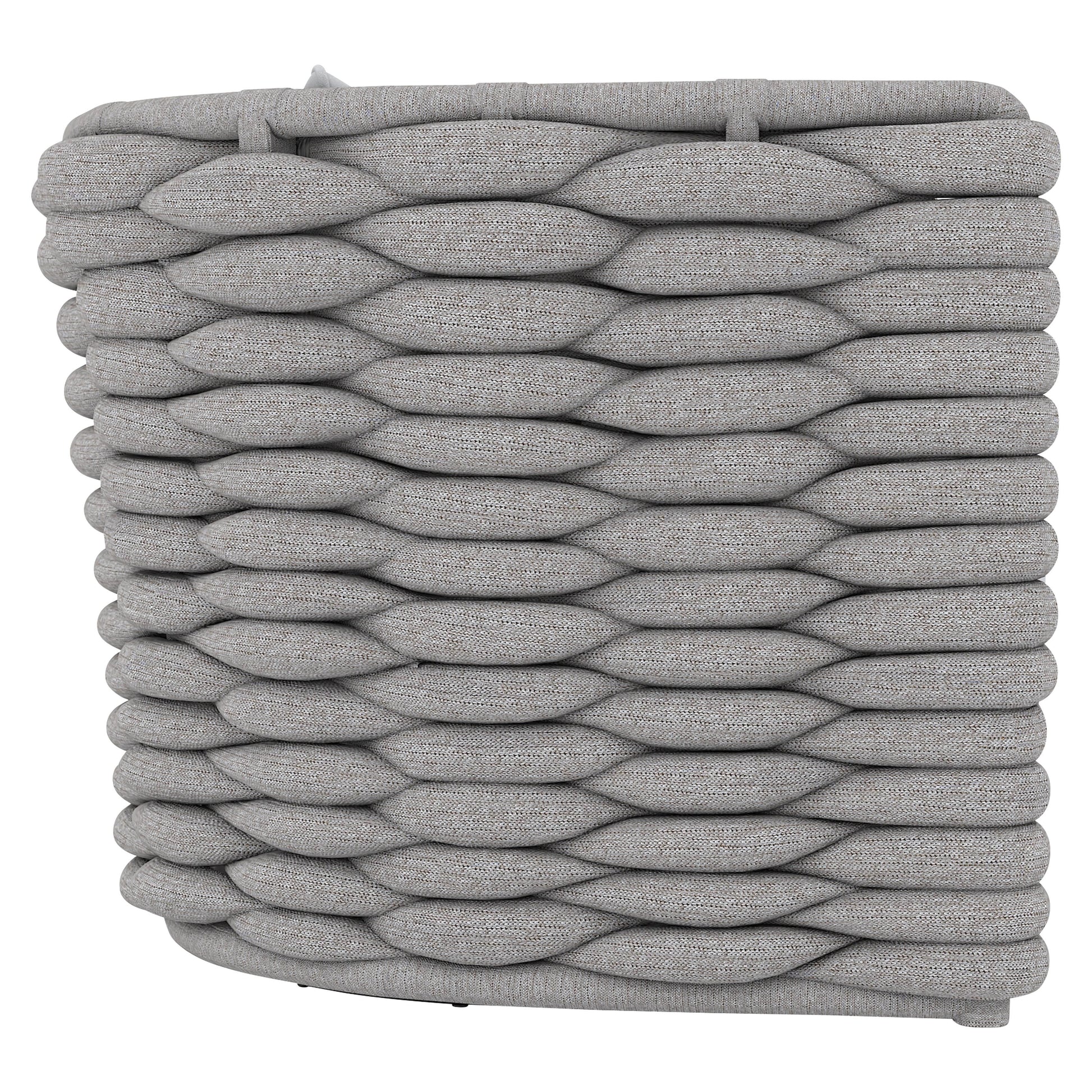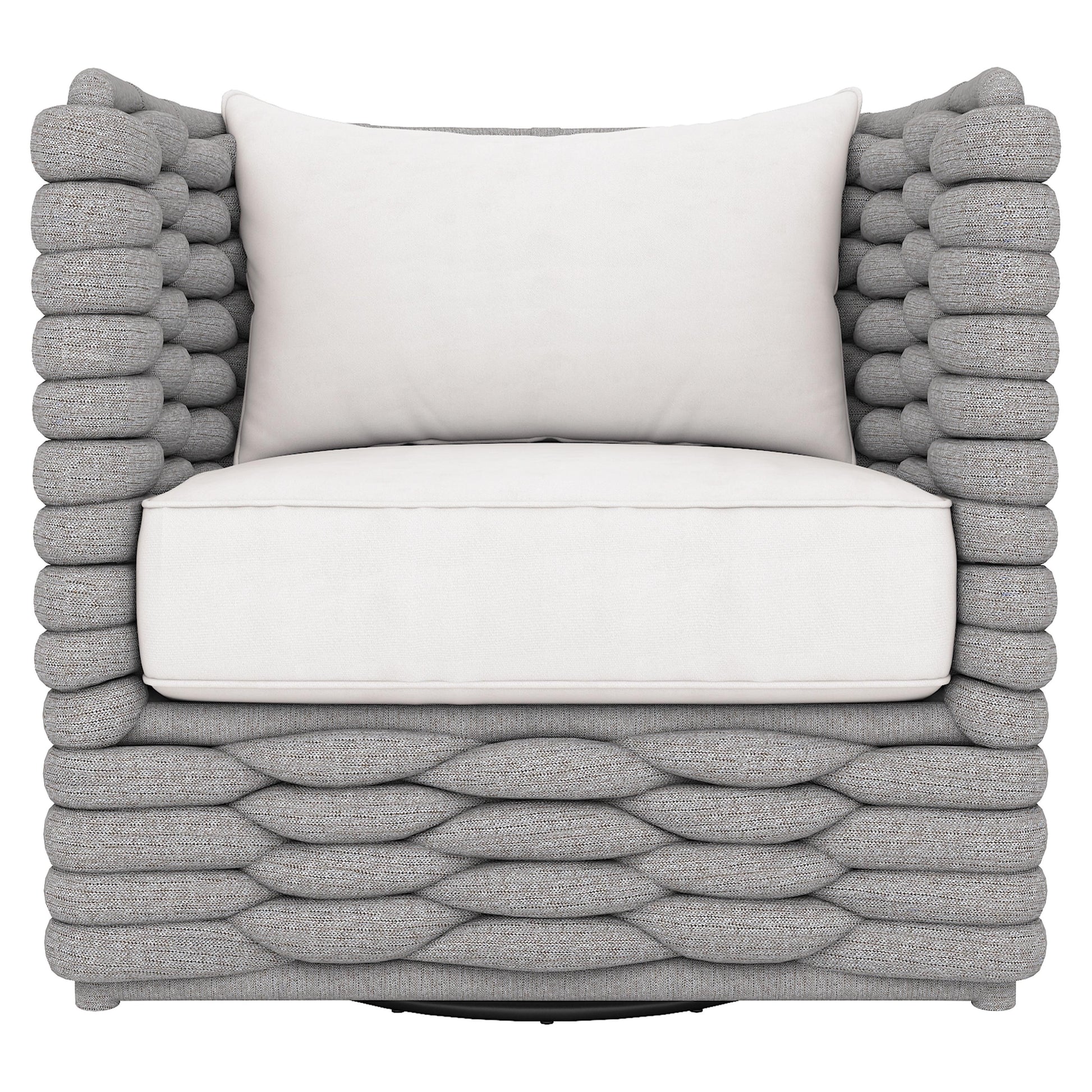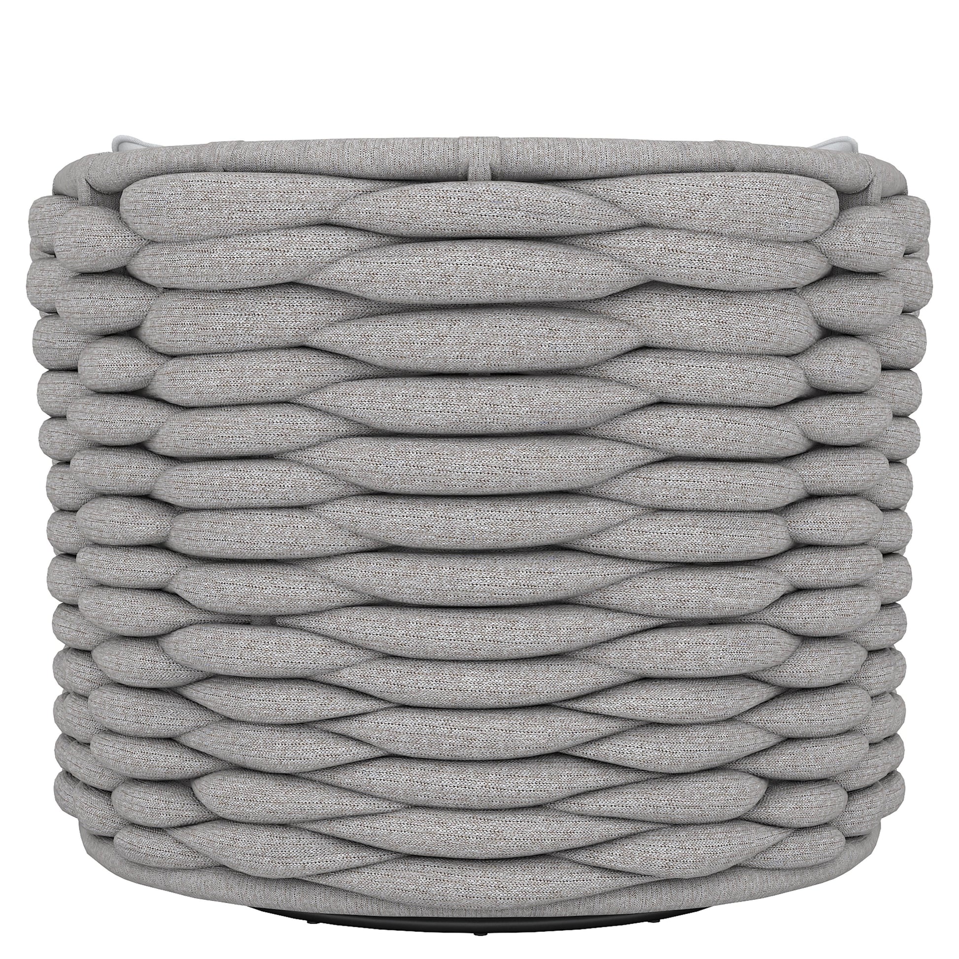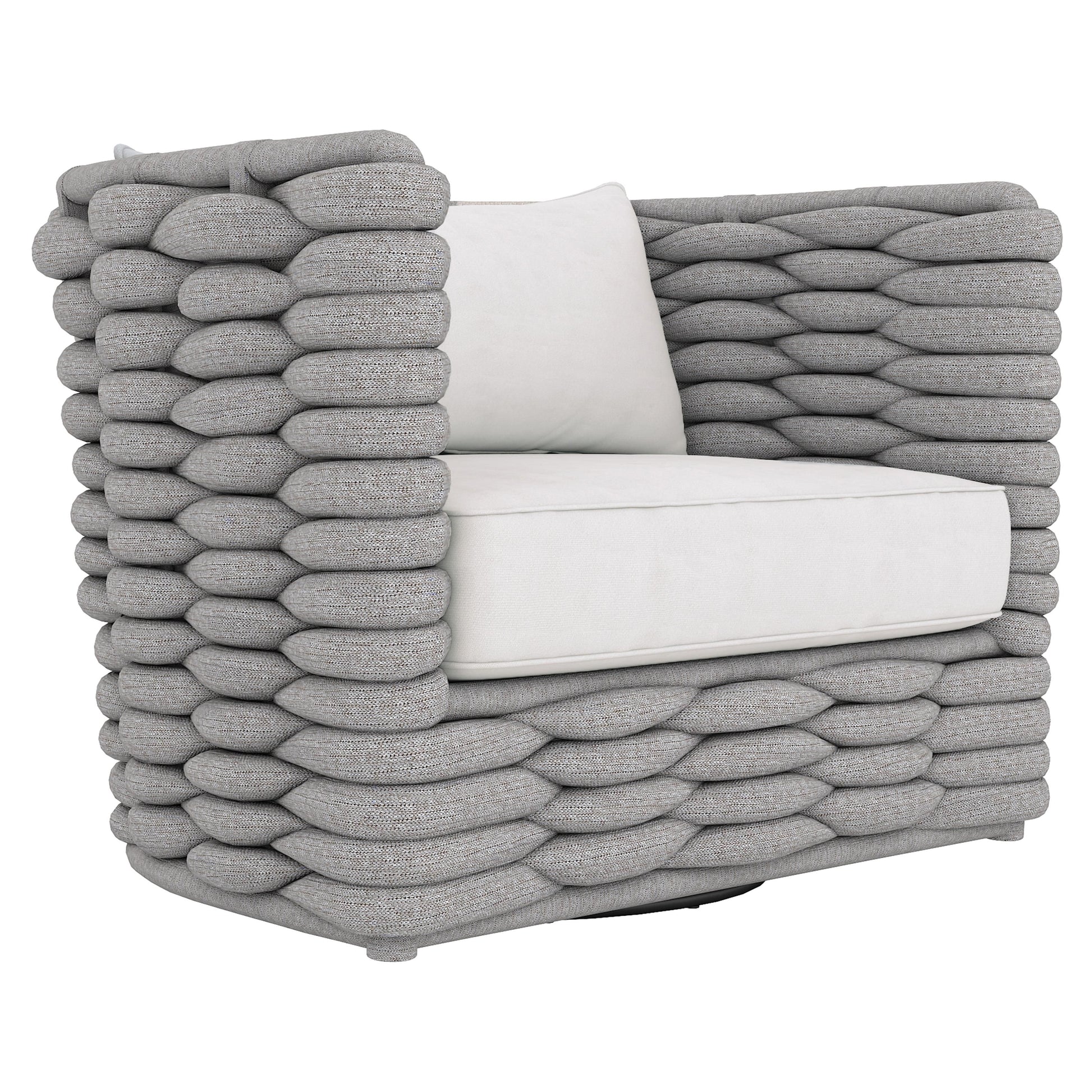 The Wailea Outdoor Swivel Chair brings sculptural presence and inviting comfort to refined outdoor settings. Its distinctive silhouette is defined by a soft-knit Nordic Gray sock weave, artfully wrapped around a powder-coated aluminum frame. The tactile texture and modern profile create a visually captivating piece that feels both relaxed and architectural.