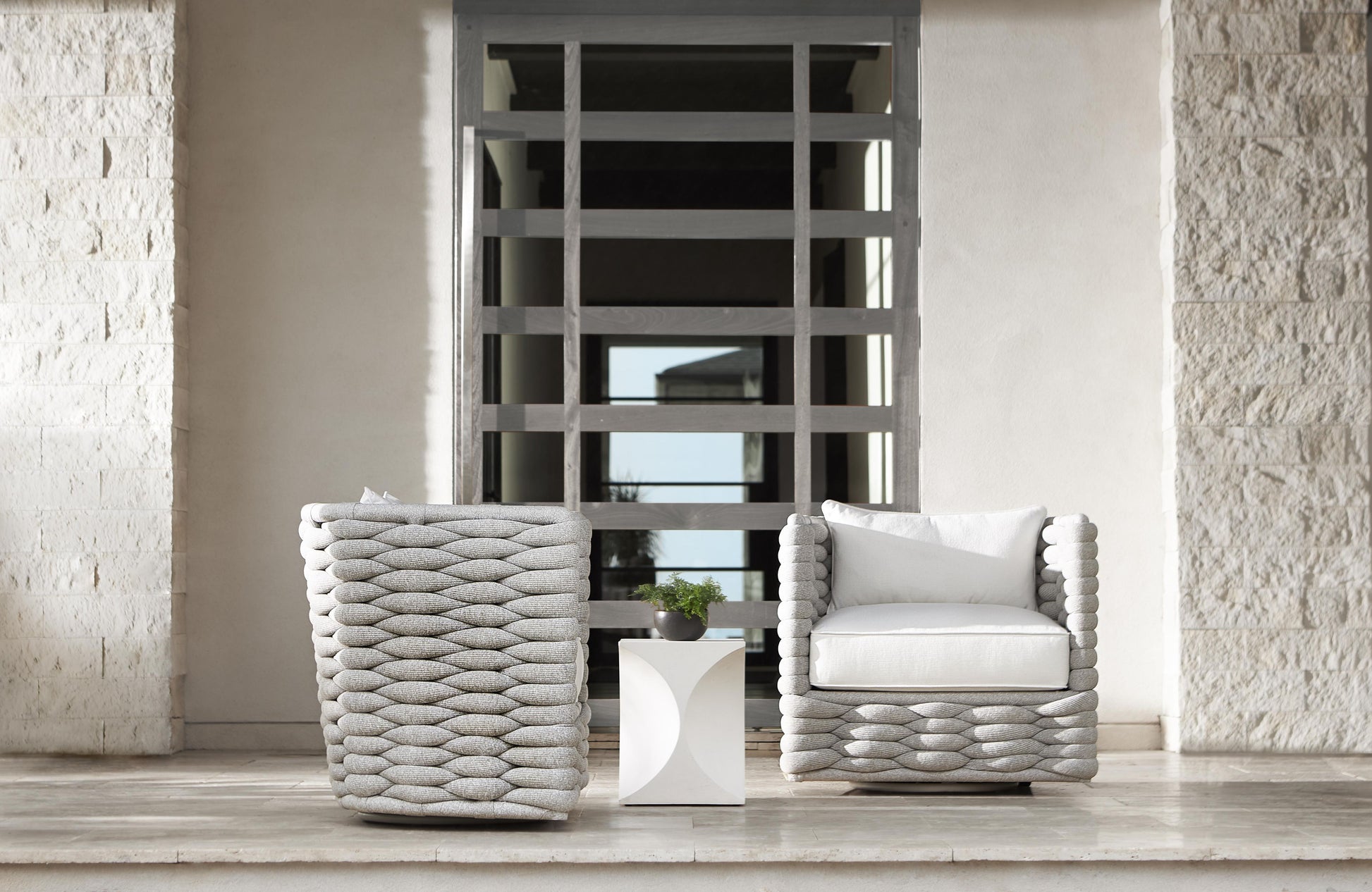 Designed for luxury outdoor living, the chair rests on a smooth swivel base in an Oyster finish, allowing effortless movement while maintaining a grounded, contemporary aesthetic. Plush cushioning, outdoor performance fabric, and exterior-grade materials ensure lasting comfort and durability, making the Wailea chair a sophisticated statement for terraces, patios, and poolside lounges.