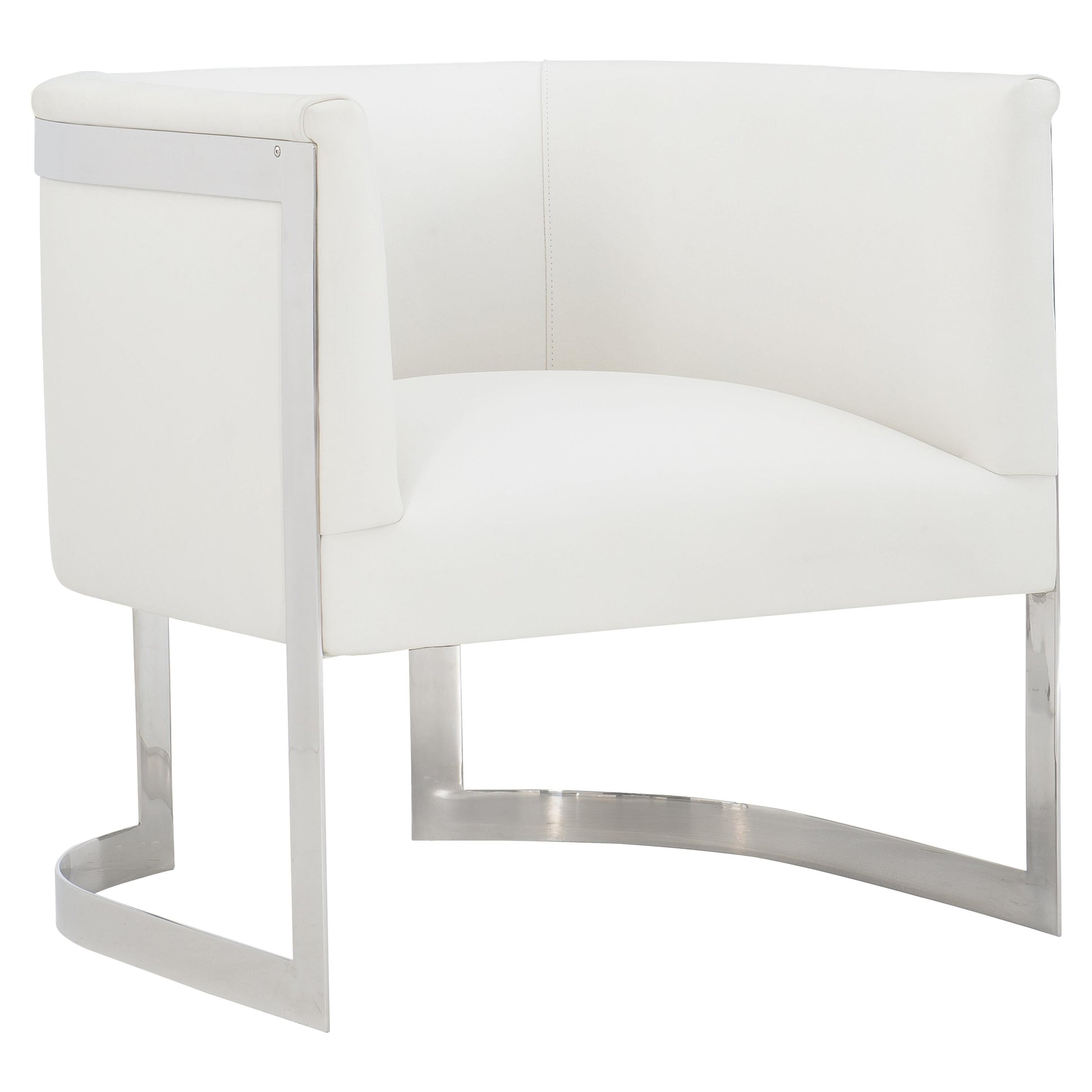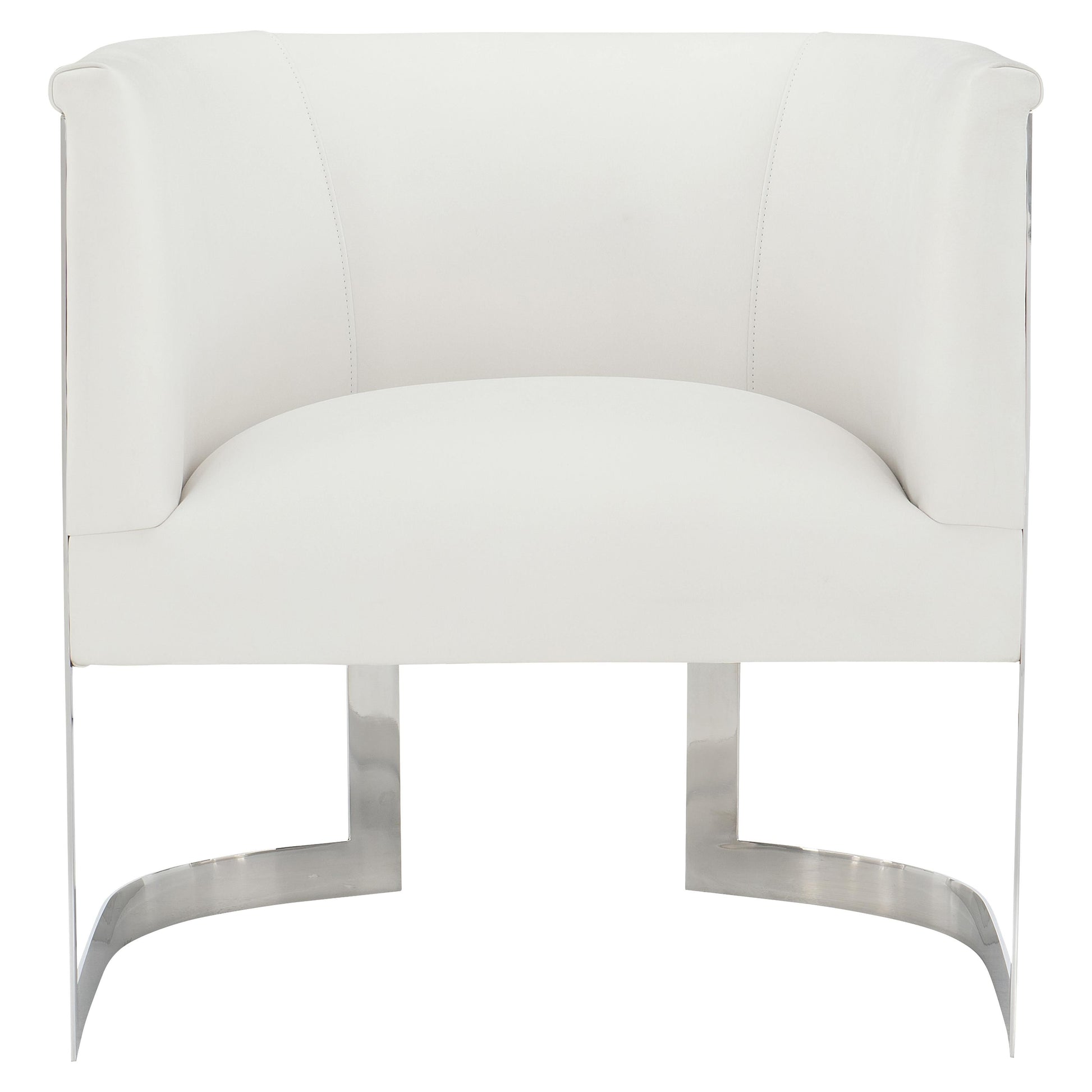 A tight seat cushion rests within a distinctive split metal frame crafted in polished stainless steel, giving the chair a refined architectural presence. Designed to stand alone or complement a curated seating arrangement, the Zola balances comfort with an unmistakable sense of contemporary craftsmanship.