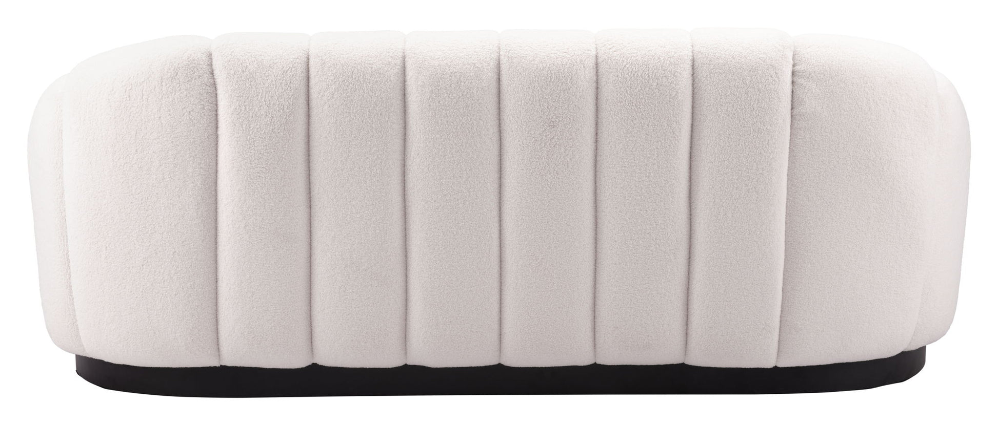 The Bhutan Sofa has a polyester boucle style fabric.This sofa works great in any space, hospitality or residential. The shape and design are glam, modern, deco and boho all at the same time.