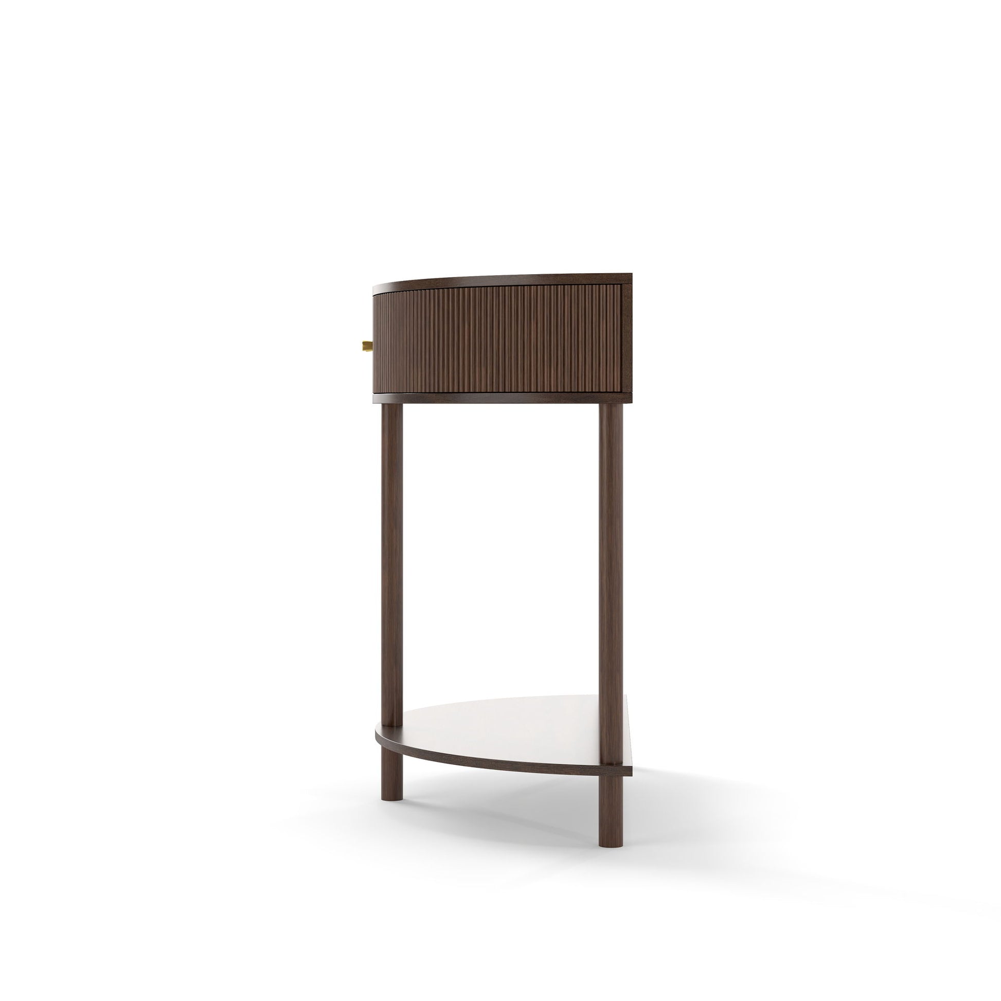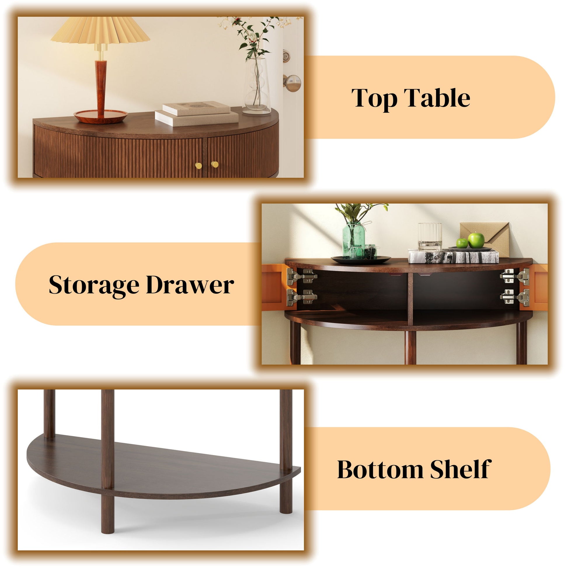 Artisan Crafted Wave Pattern Demi Lune Console Table With Brown Woodgrain, Unique Half Moon Design End Table With 2 Storage Drawers And Bottom Shelf For Living Room, Bedroom, Study, Hallway - Brown