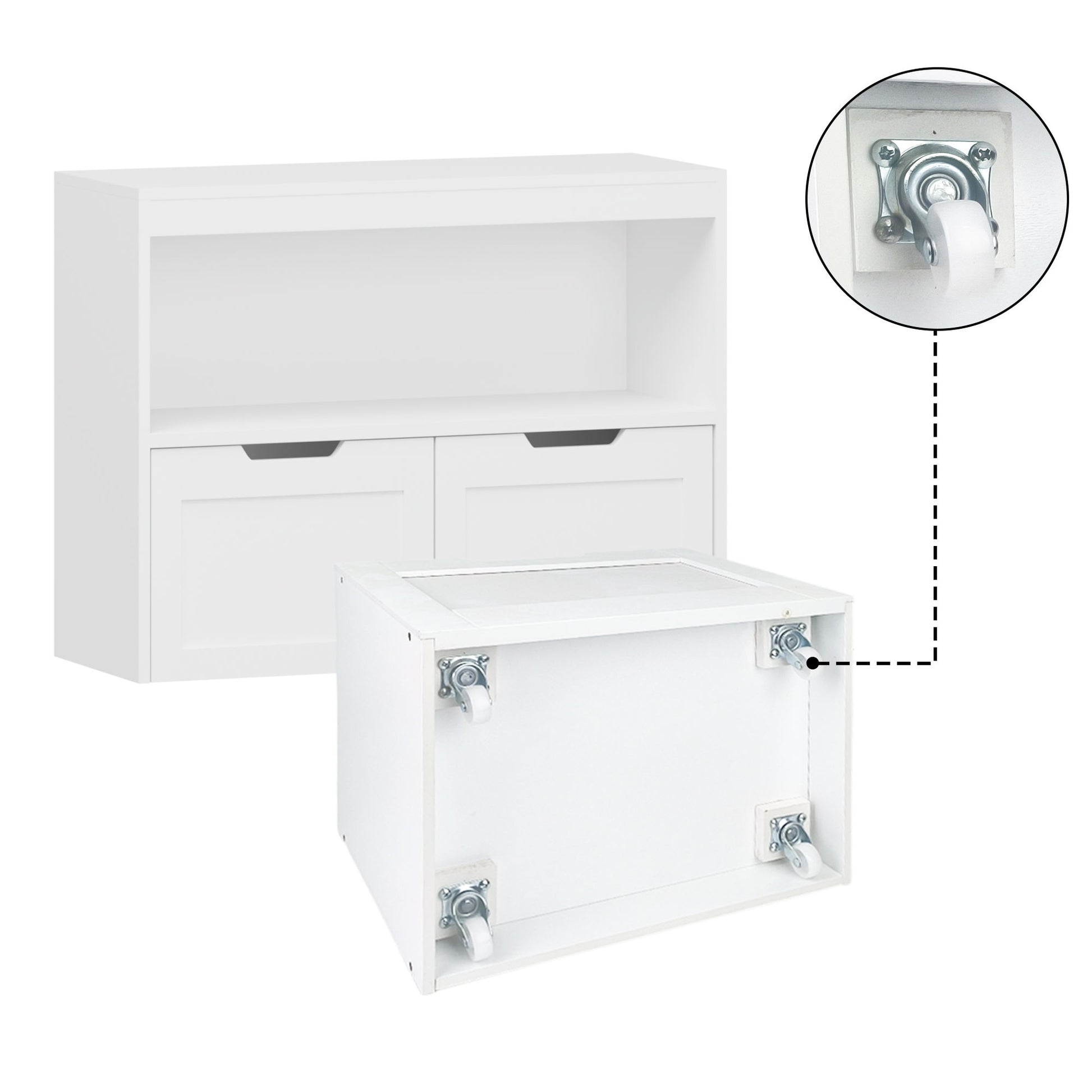 Book Organizer With Large Drawers And Open Shelves, Toy Storage Cabinet With Removable Wheels And Rounded Edges - White