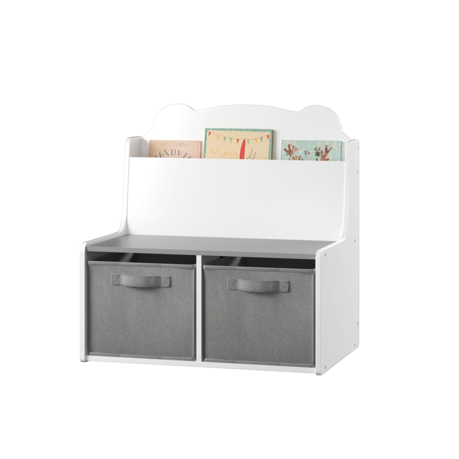 Bookshelf With Storage Bins, Bookcase With Book Display Shelf And 2 Bins, Cute Bear Shaped Backboard, Toy Organizer - White
