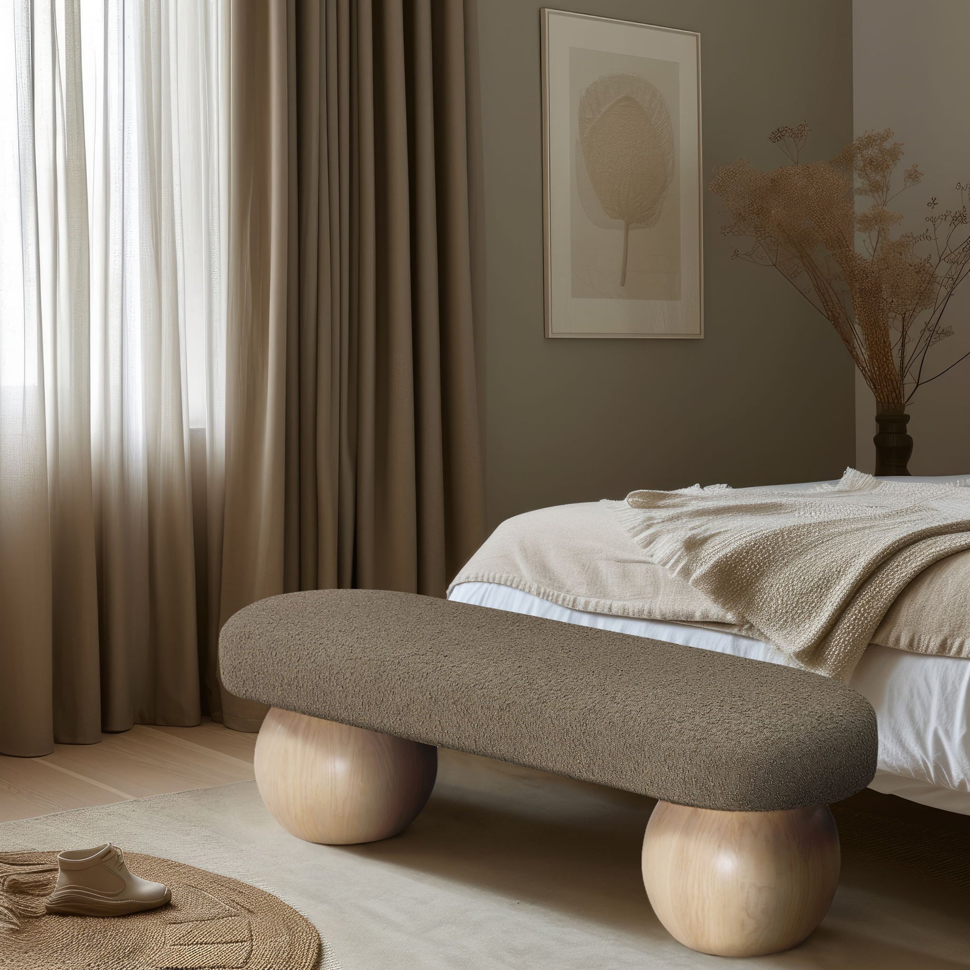 Elevate your home decor with this stunning Bowie Boucle Fabric Bench. The rich boucle fabric gives it a luxurious and sophisticated look that is sure to catch the eye of guests. The natural finish on the solid ash wood ball-shaped legs adds a touch of warmth and elegance to the piece. Whether you're using it as a stylish seating option in your living room or as a chic accent piece in your bedroom, this bench is sure to impress.