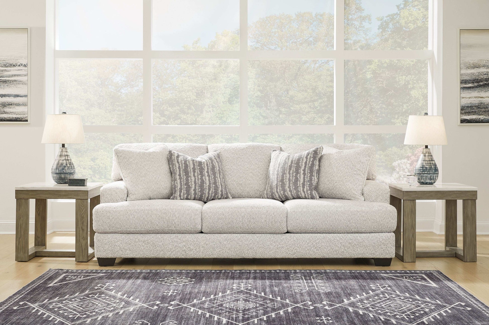 This sofa speaks to those drawn to fresh, contemporary style with richly neutral appeal. Wrapped in a wonderfully plush fabric loaded with multi-tonal interest, this on-trend piece has a warm, welcoming charm. Coordinating accent pillows add to the indulgence. Kick back, relax and settle in for comfort with this cool addition for modern spaces.