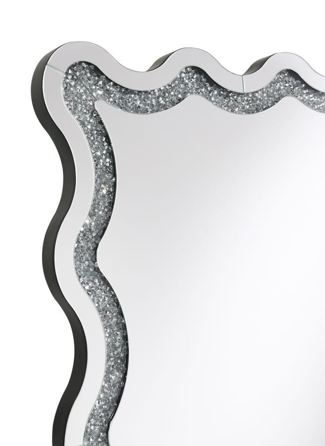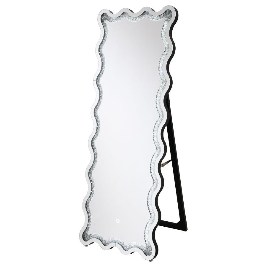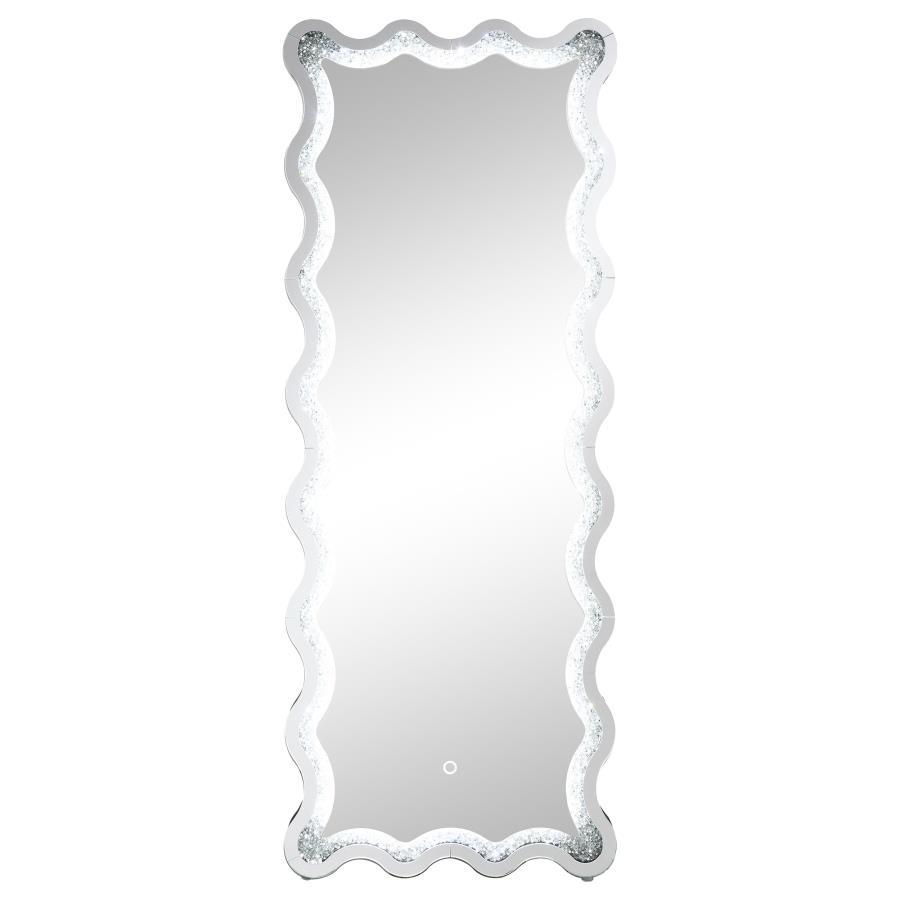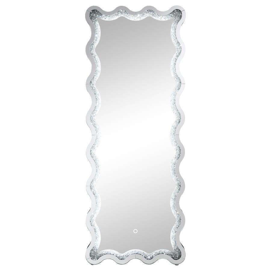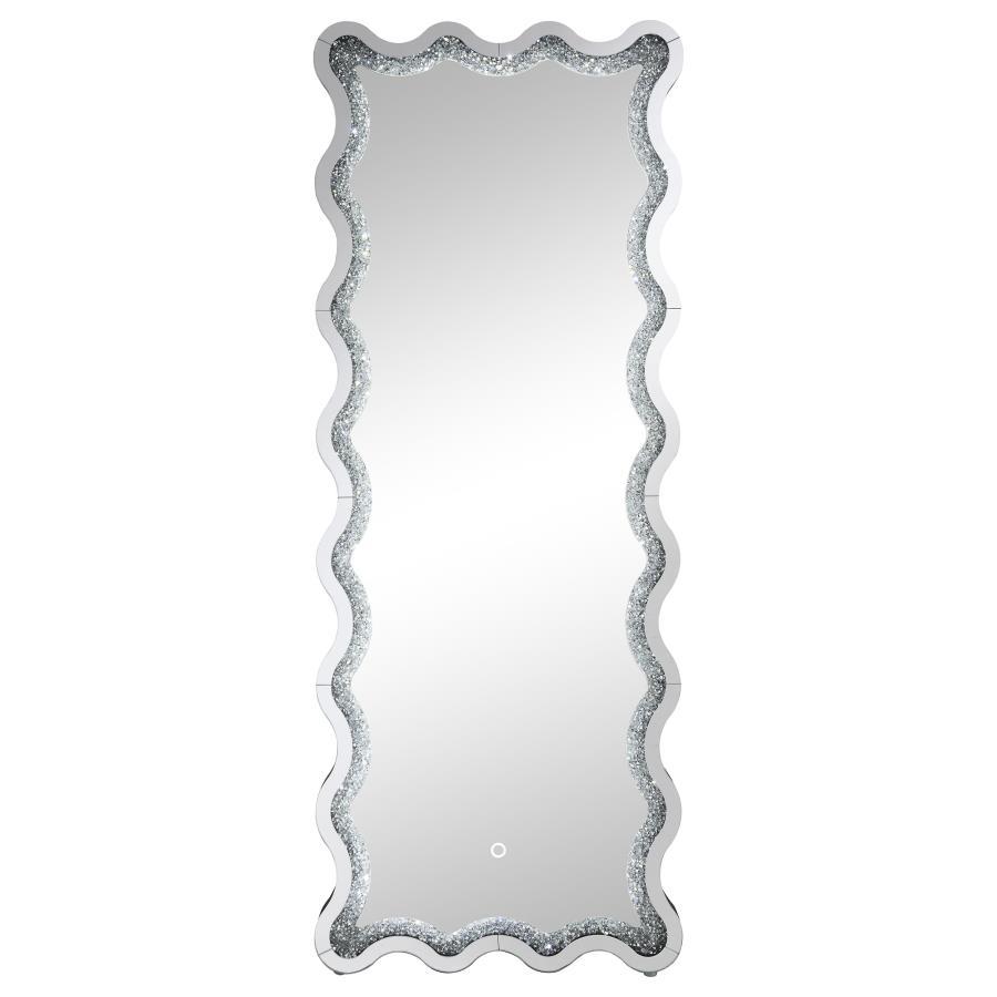 Introduce modern glam sophistication to your bedroom or living area with a contemporary LED floor mirror. It includes a frame that allows it to stand on its own, creating the option for placement anywhere in your space. The mirror boasts a dynamic frame design, with a wavy silhouette created with convex and concave curves that introduce a flowing, engaging ambiance. Mirror and diamond-like trim layers create sparkle and sophistication, perfect for a modern glam bedroom setting. The mirror includes an LED light, perfect for illuminating your daily wardrobe choices in a master suite.
