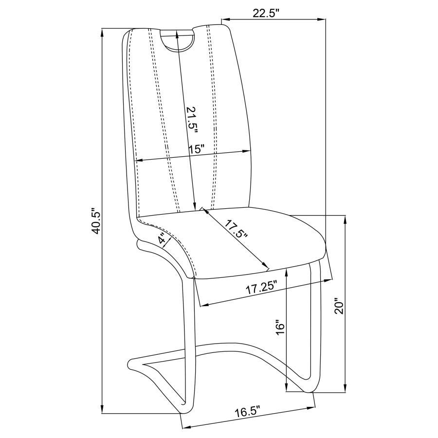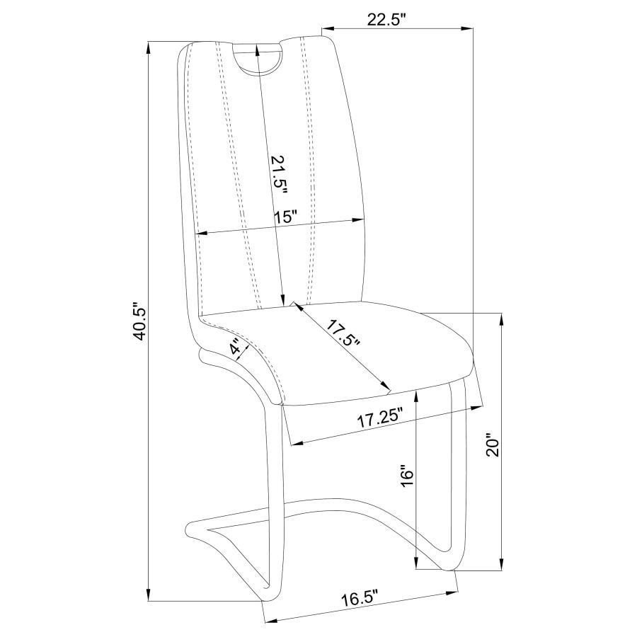 Sleek and stylish, this side chair features a modern cantilever design with a two-tone faux leather finish. Upholstered in soft grey with crisp white accents, the chair showcases a sculpted silhouette highlighted by tailored welt trim. A polished chrome base adds contemporary shine and retro flair, while the integrated handle offers easy movement. Perfect for elevating any modern dining space.