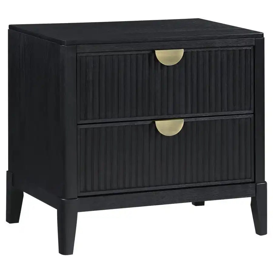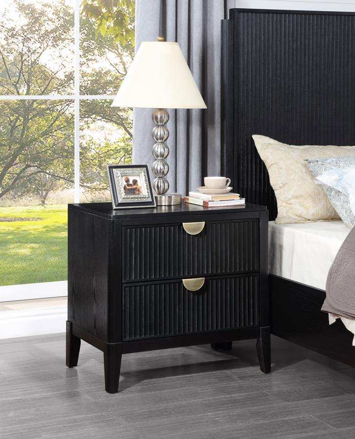 Augment your sophisticated bedroom with the addition of a modern two-drawer nightstand. It boasts a classic stance, with two drawers that offer a place for overnight essentials and personal necessities like books. The top drawer includes felt lining while half-moon pulls add metallic contrast with a soft golden hue. Drawer fronts are fluted, offering impressive texture and dimensionality at your bedside. Its black finish is wire brushed, adding the perfect touch of texture and depth.