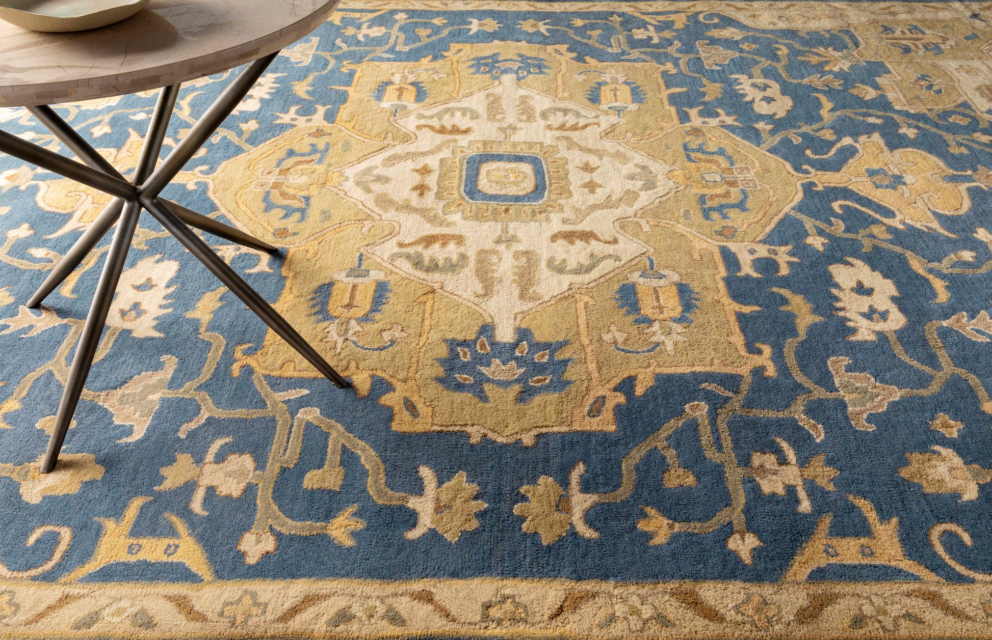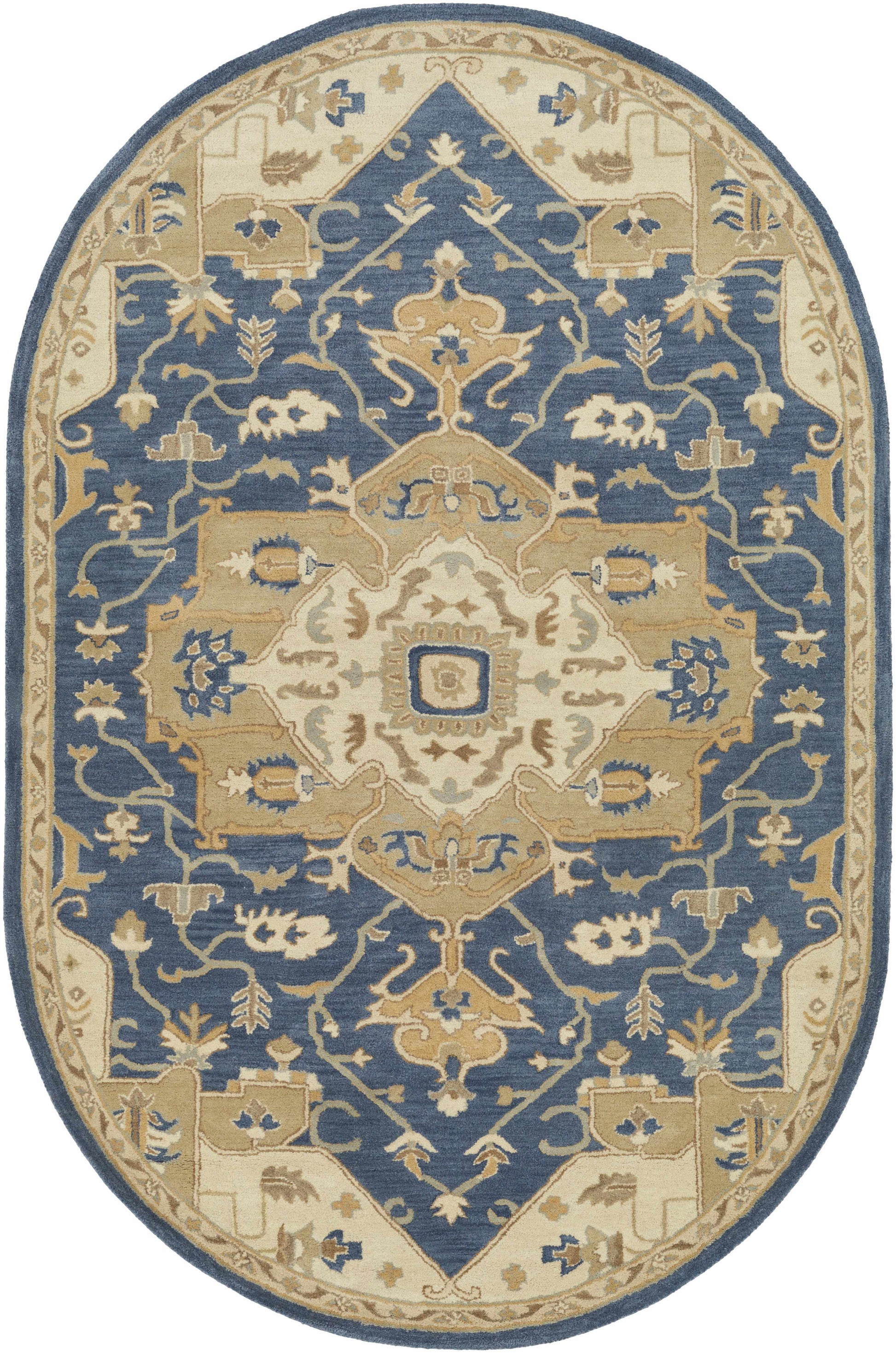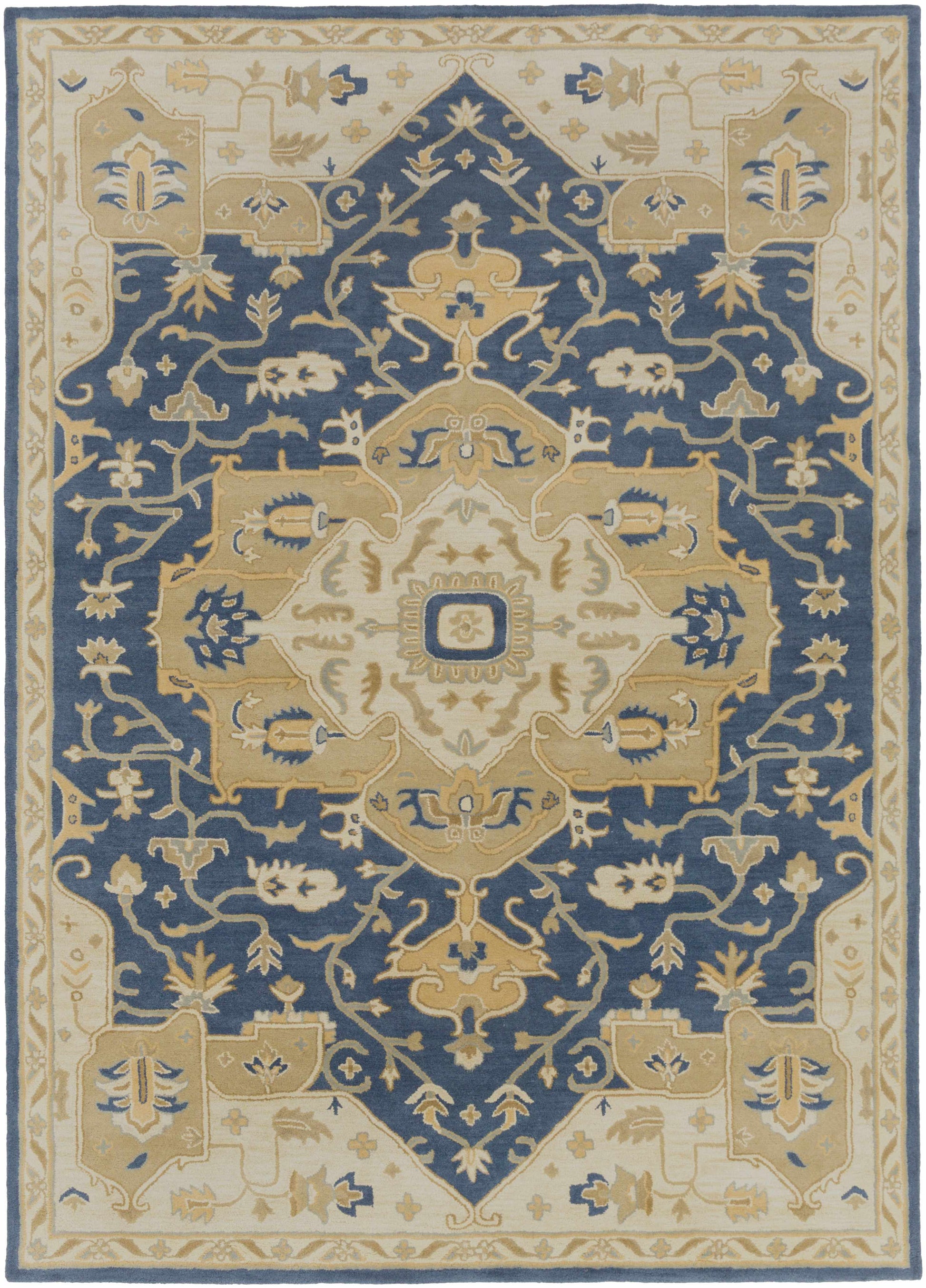 About: A traditional vintage Persian-style rug with a modern twist. This beautiful rug is hand tufted with 100% wool, making it extremely durable and long-lasting. It's also available in various shapes and sizes including round, square, runner, oval, hearth The subtle colors of blue and tan are perfect for any traditional decor. |
