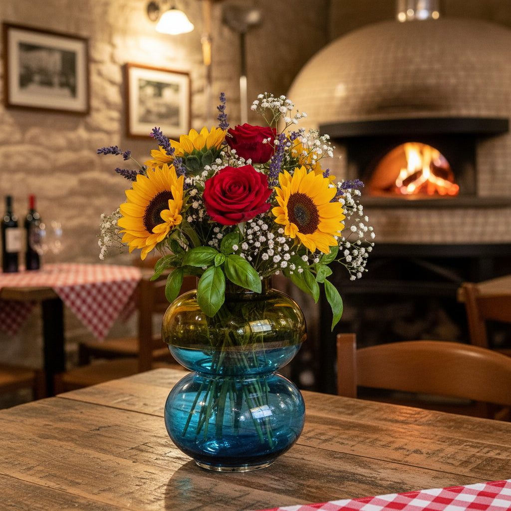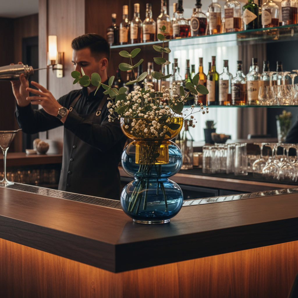 Blue Glass Vase – The Bubble Large Yellow & Blue Vase combines the vibrant colors of yellow and blue, creating a bold and striking design. This blue glass vase is perfect for displaying fresh flowers, decorative branches, or simply as a unique statement piece in your home. The dynamic color combination and large size make it a standout piece for any space.