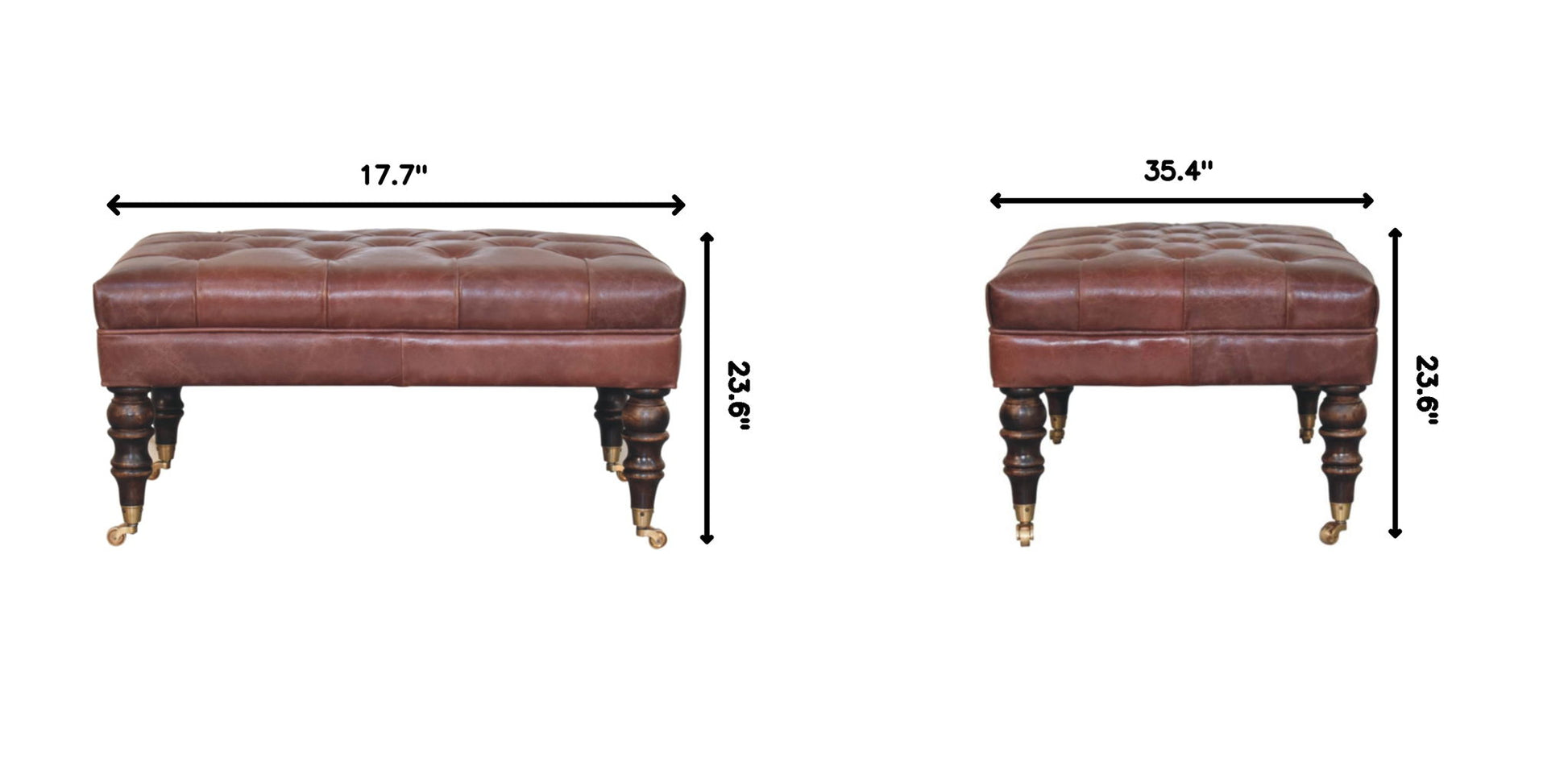 - Buffalo Leather Ottoman With Castor Legs - Combining comfort and practicality, this ottoman is upholstered in 100% buffalo hide leather, radiating luxury and durability. Crafted from 100% solid mango wood, its sturdy construction harmonizes strength with elegant grains. Hand-turned feet, finished in light, add stability and artisanal charm. With a deep-buttoned top, it's both a statement of sophistication and a functional addition to your home.