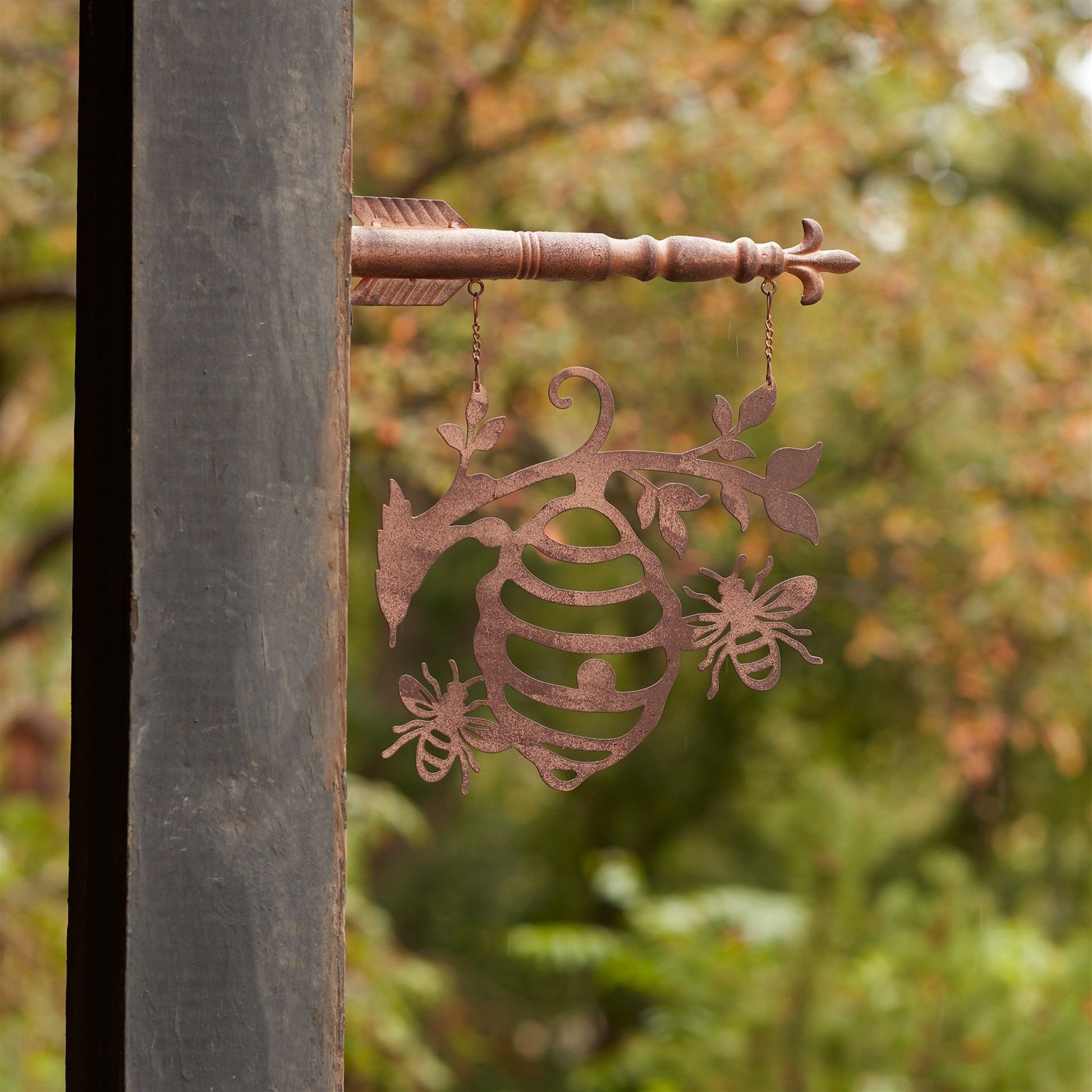 Transform your outdoor space into a charming and whimsical haven with our Bumble Bee Hive Hanging Garden Sign. Crafted from high-quality iron metal, this 15.5" tall piece features a distressed bronze finish and a delicate cut-out bee hive with bumble bee accents. The perfect addition to your spring and summer decor, this sign is sure to catch the eye of your visitors.