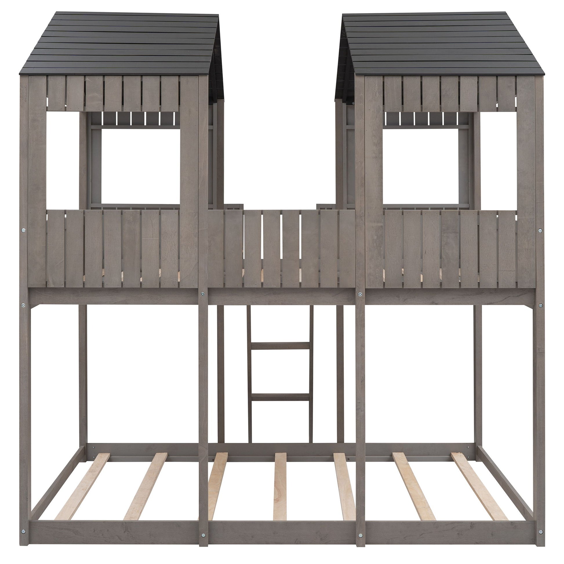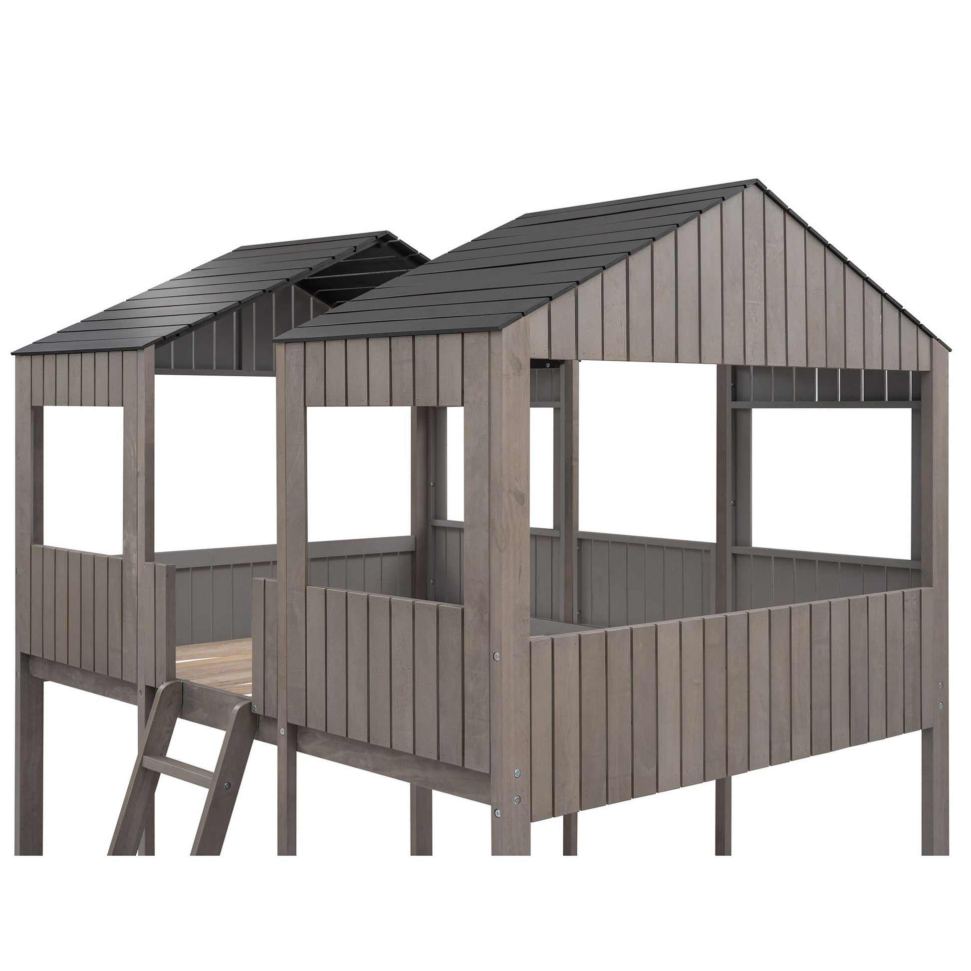 Full Over Full Bunk Bed With Roof, Window, Guardrail, Ladder - Antique Gray