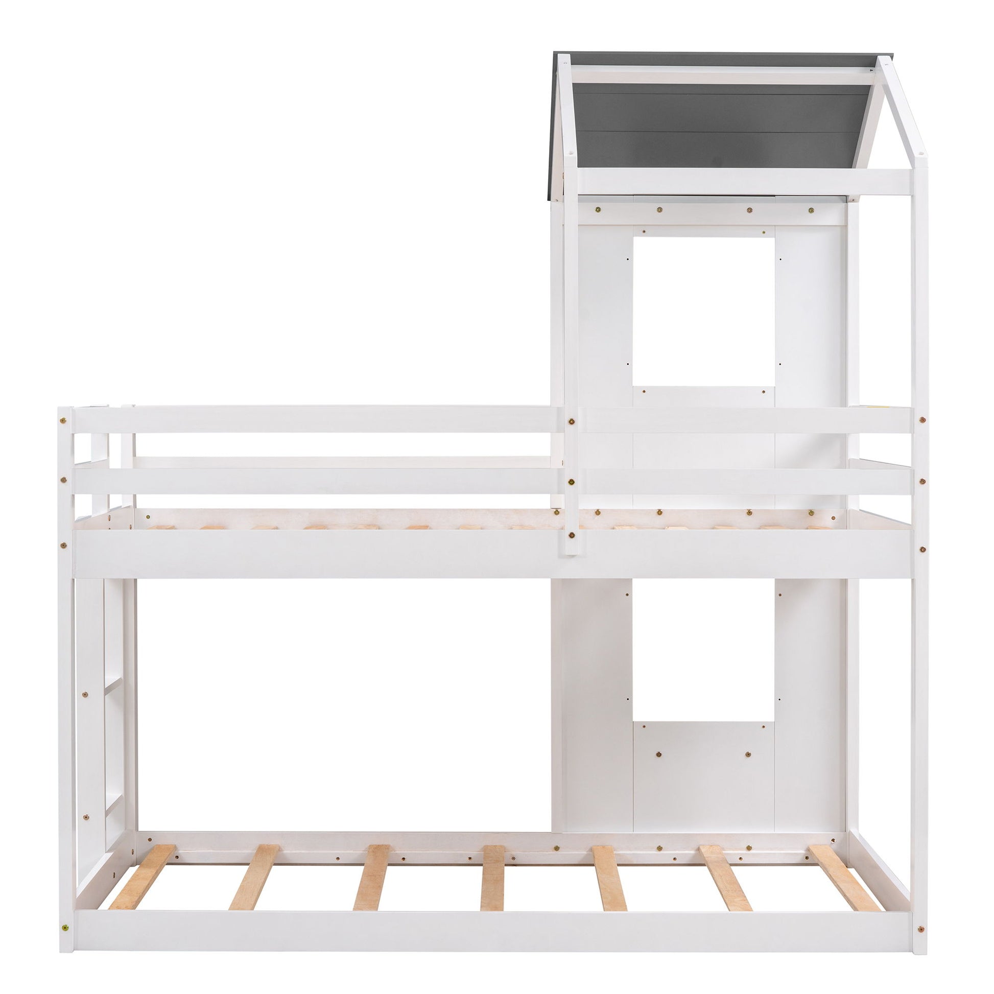 Twin Over Twin Bunk Bed & Roof, Window, Guardrail, Ladder - White