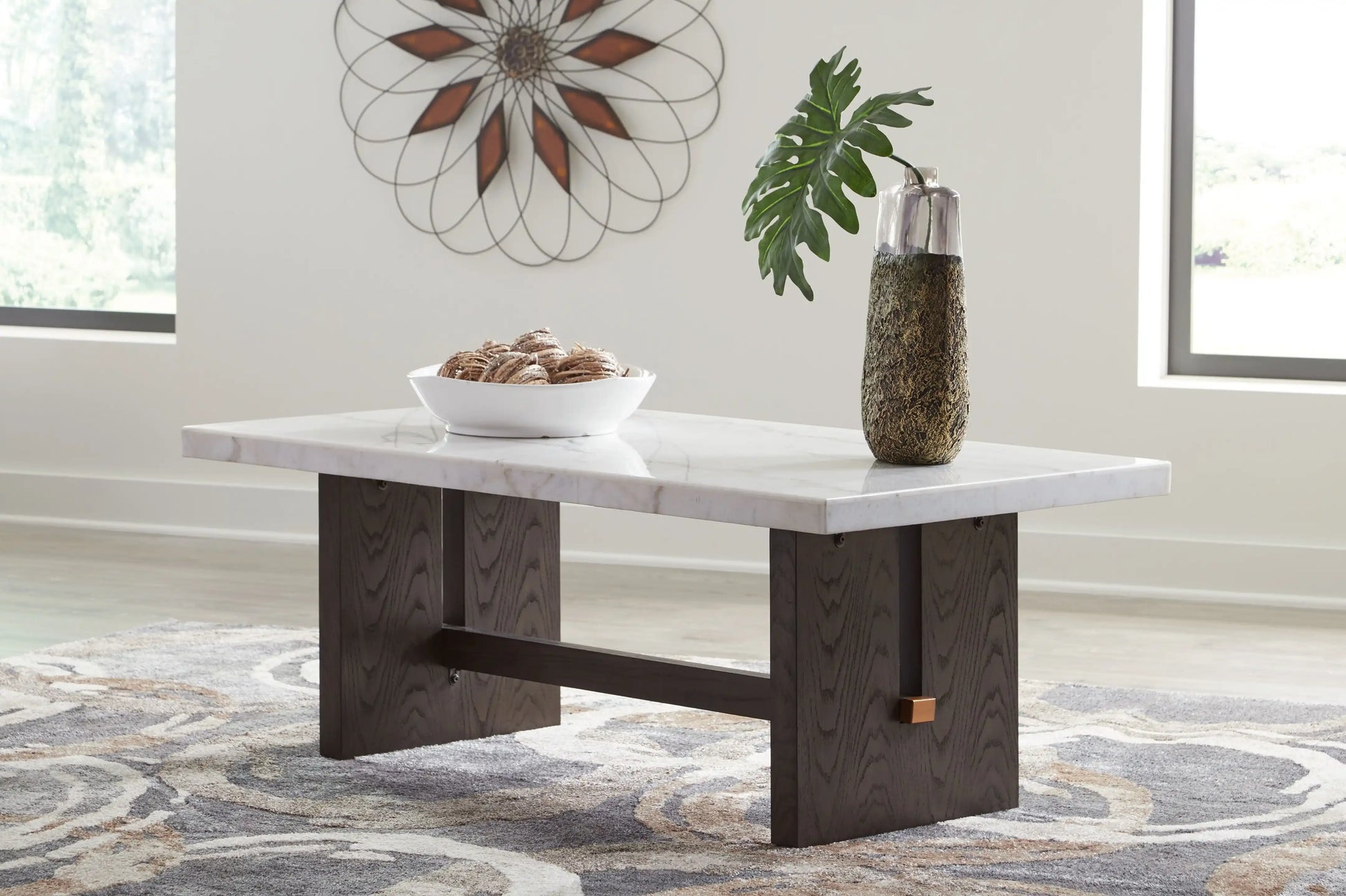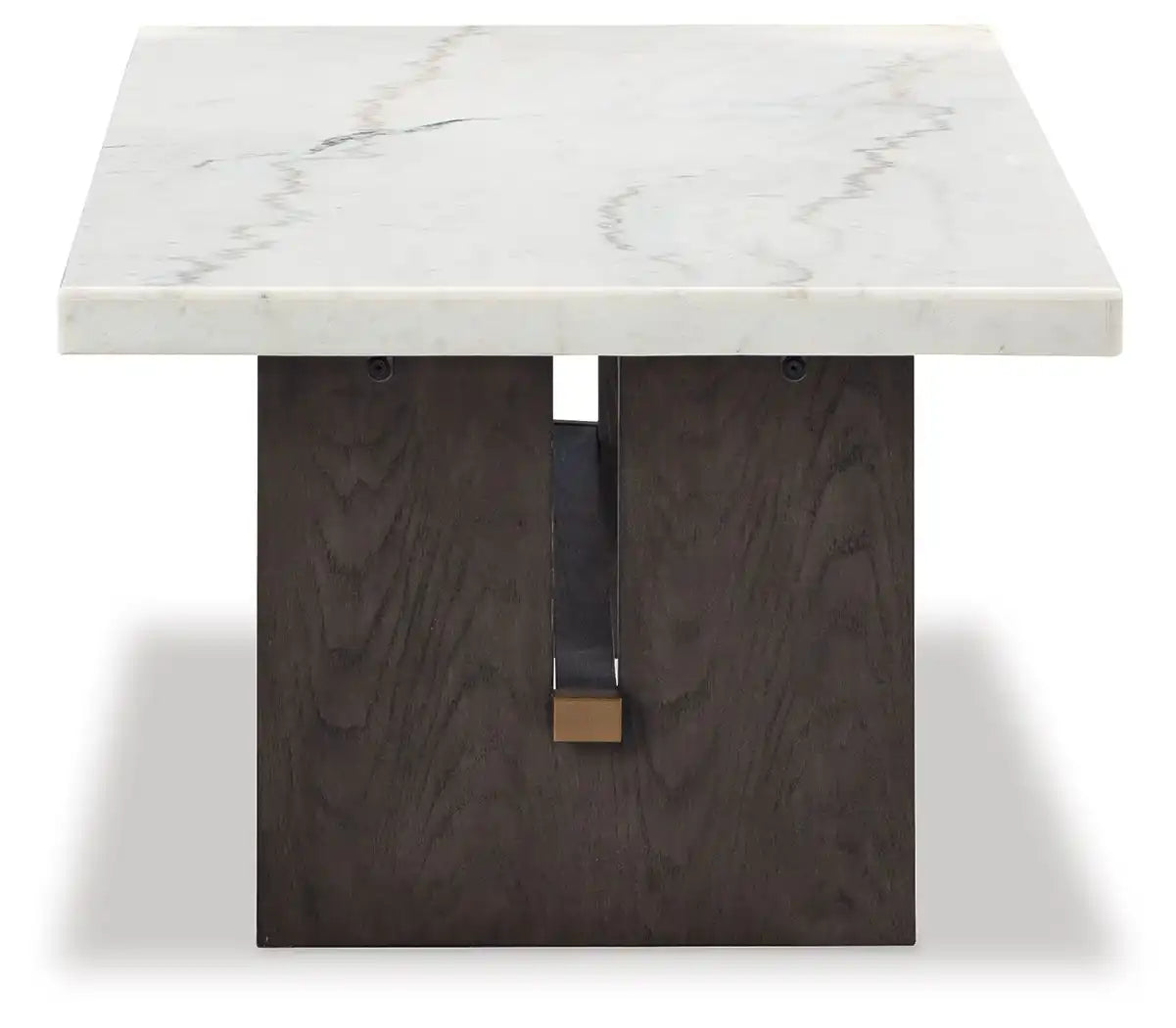 Dressed to thrill, this simply stunning coffee table offers a high-design look at a down-to-earth price. Ultra-sleek lines are accentuated with a dark waxy brown oak finish that’s so easy on the eyes. Clean-lined and modern, the plinth base and natural marble tabletop showcase quality craftsmanship and attention to detail. This table is the perfect centerpiece for a living room or family space, with a timeless look that's made to last.