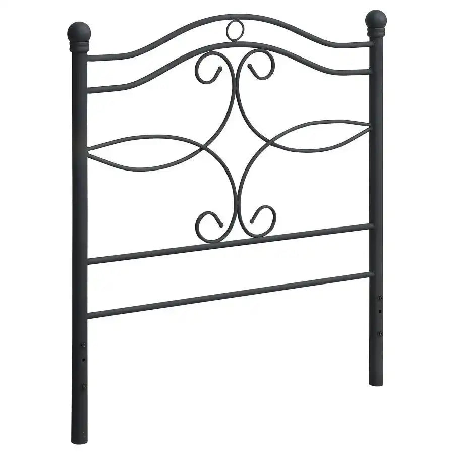 This metal twin headboard adds a sleek, unique panache to a simple metal bed frame. It features two gently arched curves at the top with metal rods underneath fashioned in ornate curves and swirls for a stylishly elaborate appearance. Both posts are topped by round knobs that are simple yet appealing. Finished in understated matte black that suits any modern decor. Also comes in full and queen sizes.