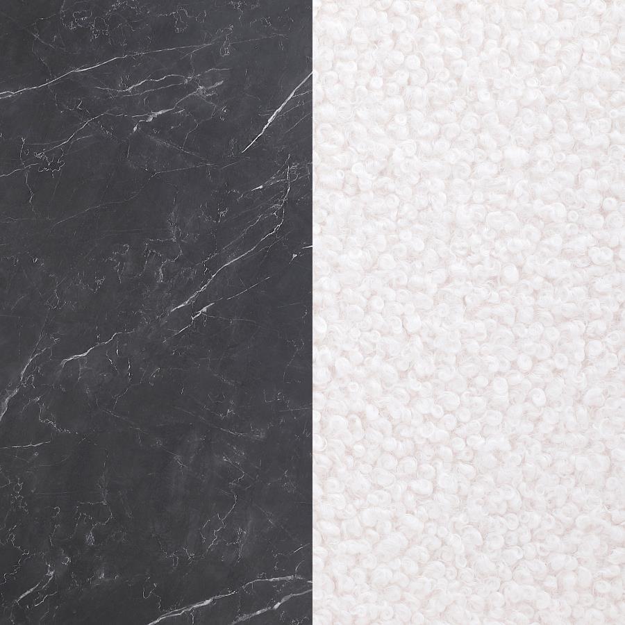 Reimagine your dining room with the fresh, elegant character of a five-piece modern dining set. Centered on a round table with a faux black marble tabletop, the set offers compelling contrast and dimension in a kitchen or dining room. The tabletop is printed black melamine, designed to provide seamless character at an affordable price point. The base of the table is a star pedestal crafted in hammered black metal, offering artistic flair to your space. Four side chairs complete the set, pairing black hammered legs with plush cream upholstery with charming texture and plush cushioning.