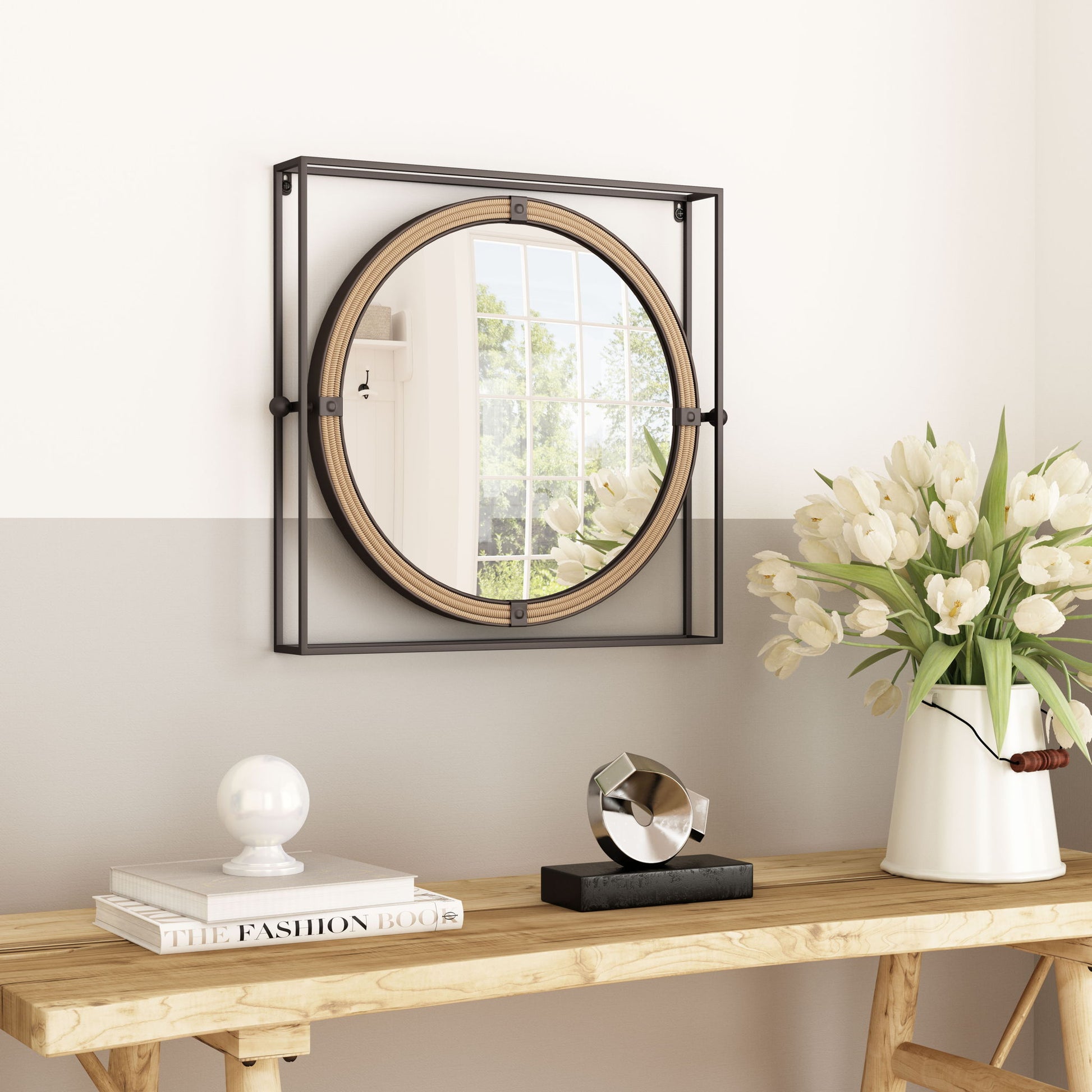 Industrial and urban, glam and chic, the Capell Mirror has a painted steel frame and center mirror surrounded by a polyester rope framed pattern. It looks good in any space as a decorative wall piece or a personal mirror.