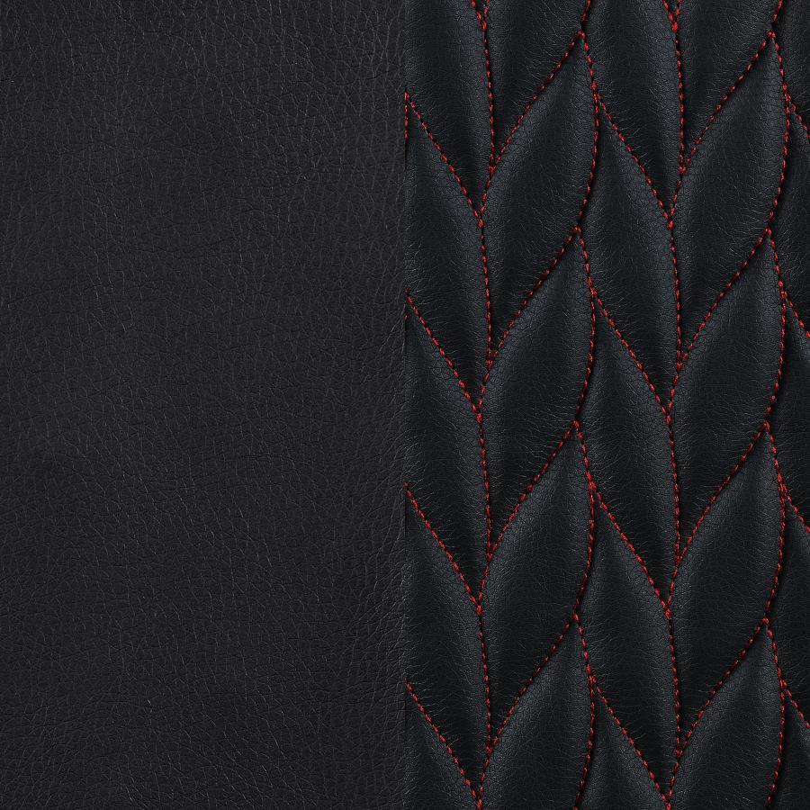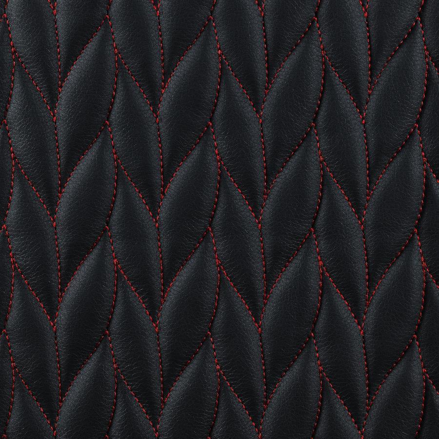 Perfect for a modern home office, this contemporary office chair is wrapped in a black leatherette that offers a bold statement piece. Accenting the black leatherette is a botanical-inspired herringbone pattern with a red stitching details, giving a subtle pop of color. Rounded padded arms provide a place to rest your elbows, while a padded headrest and seat offer long-lasting all-day support. Mounted to a rolling base with five wheels, this mobile office chair easily glides throughout the office space to retrieve items and more. In addition, this office chair can be adjusted, lifted to fit your preferable desk height.