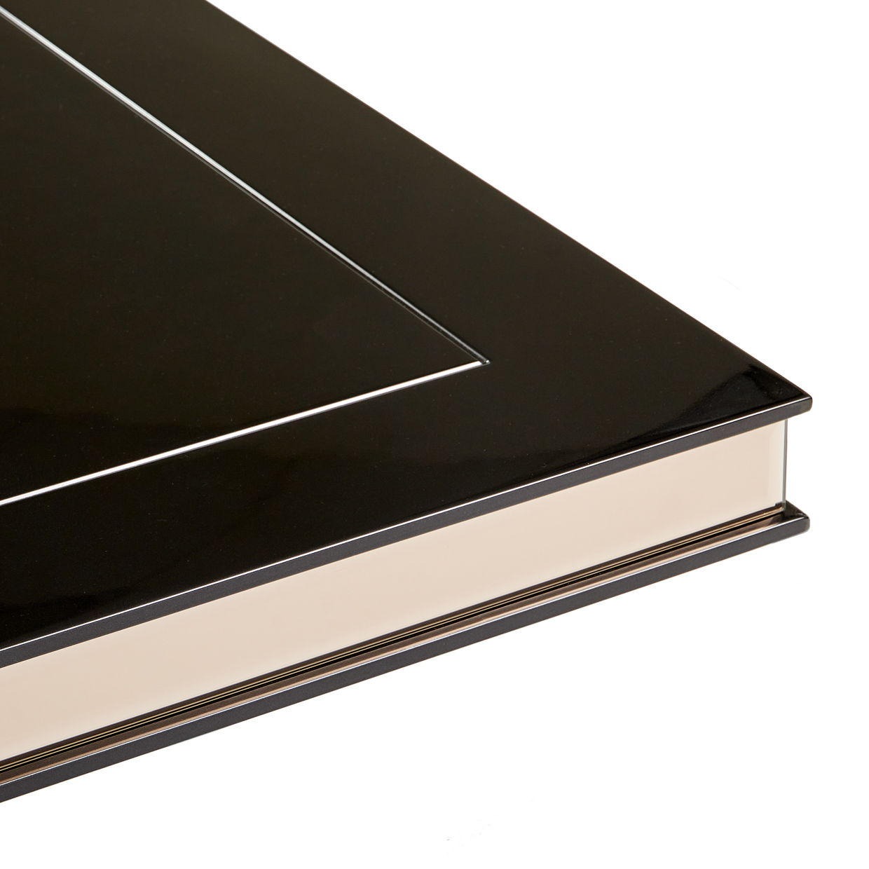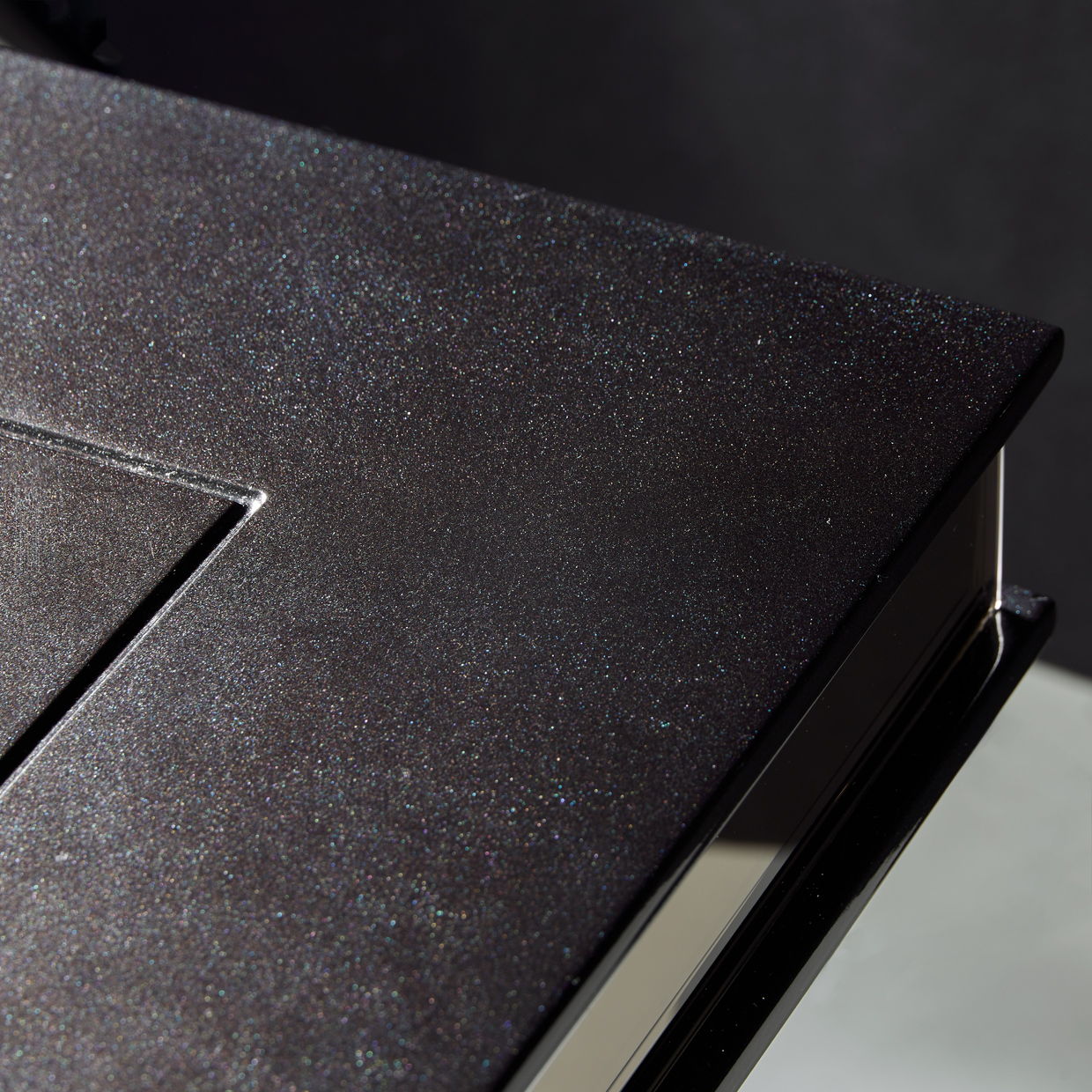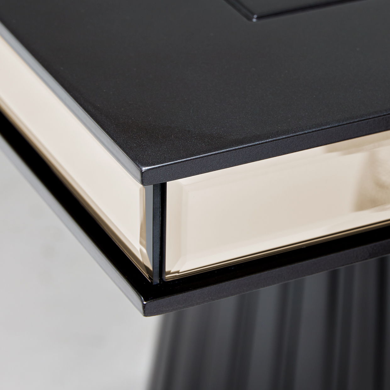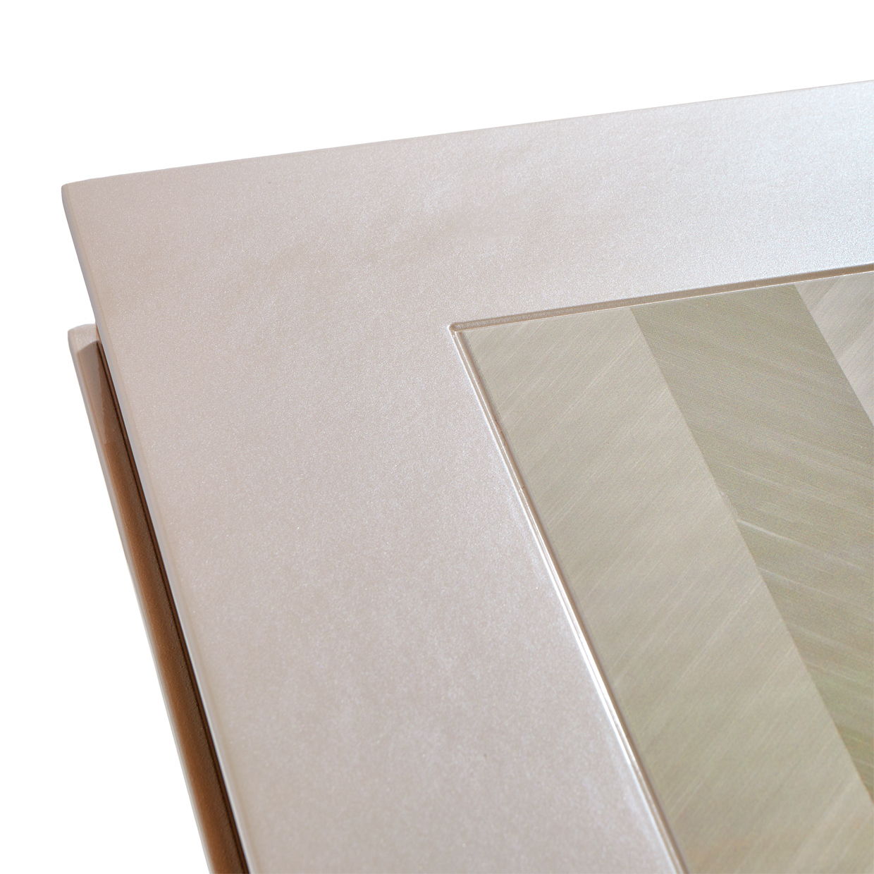 Fall in love with the artistry of the Carmela Dining Table — a centerpiece that embodies modern elegance. This stunning table features a distinctive chevron-patterned top, finished in high-gloss polyurethane lacquer for a sleek, durable shine. The tabletop is beautifully framed by a mirrored inlay along the apron, adding a touch of glamour to its clean lines. Supported by sculptural pedestals titanium accents, the Carmela Dining Table transforms your dining space into a scene of luxury and charm.