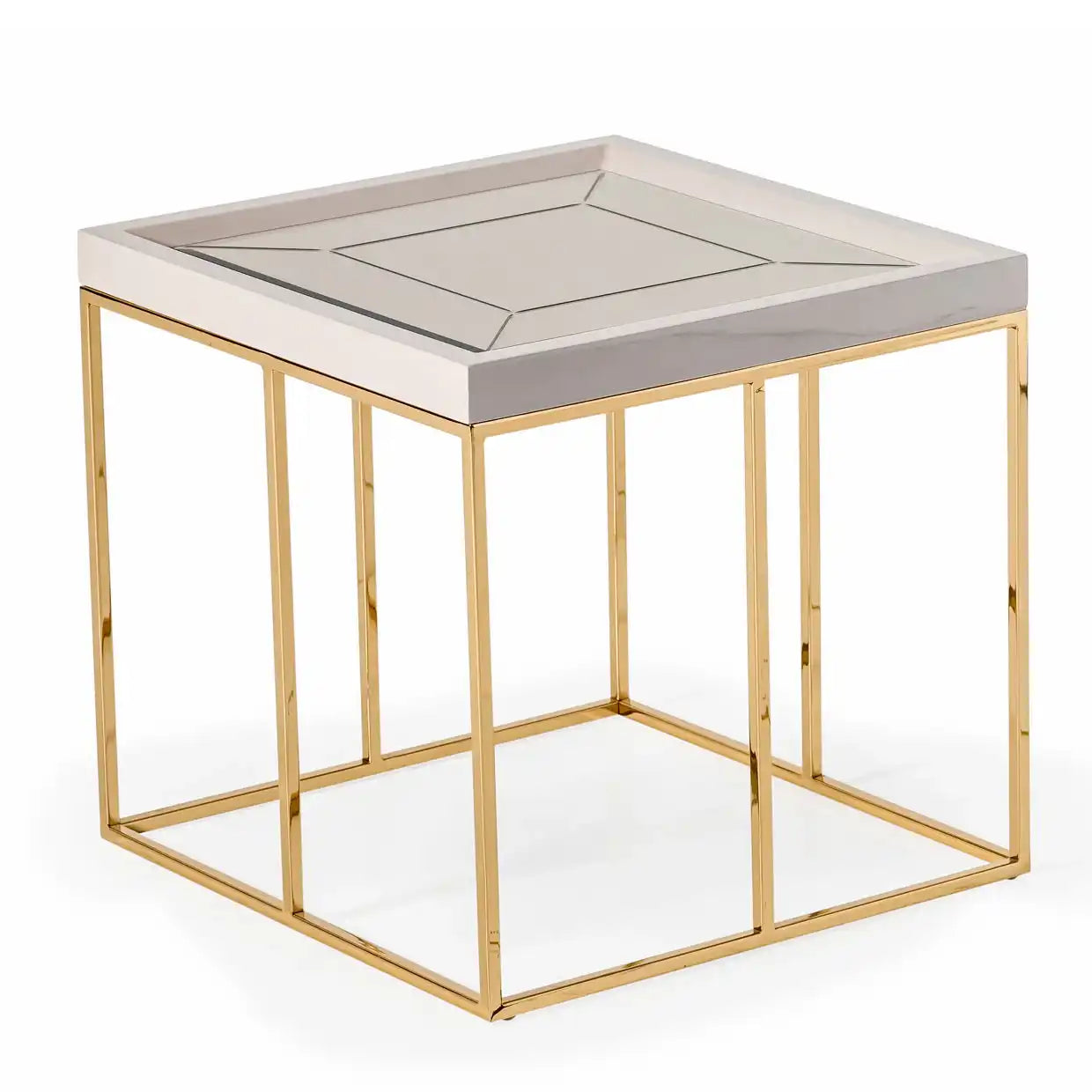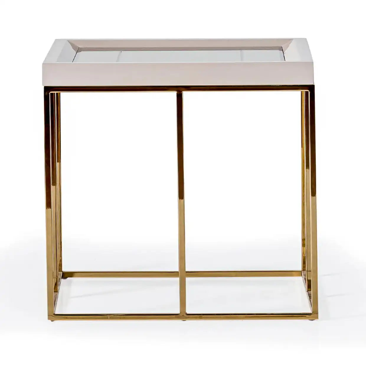 The perfect sidekick. Whatever you pair the side table with will immediately upgrade its look. The stunning piece features beveled mirror panels that add a sense of depth and intrigue to the piece. The shimmering ivory finish and matching titanium gold legs create a luxurious and sophisticated look that complements the rest of the Carmela collection. Use it as a side table for your favorite chair or as an accent table in another room and enjoy the versatility and style that it brings.
