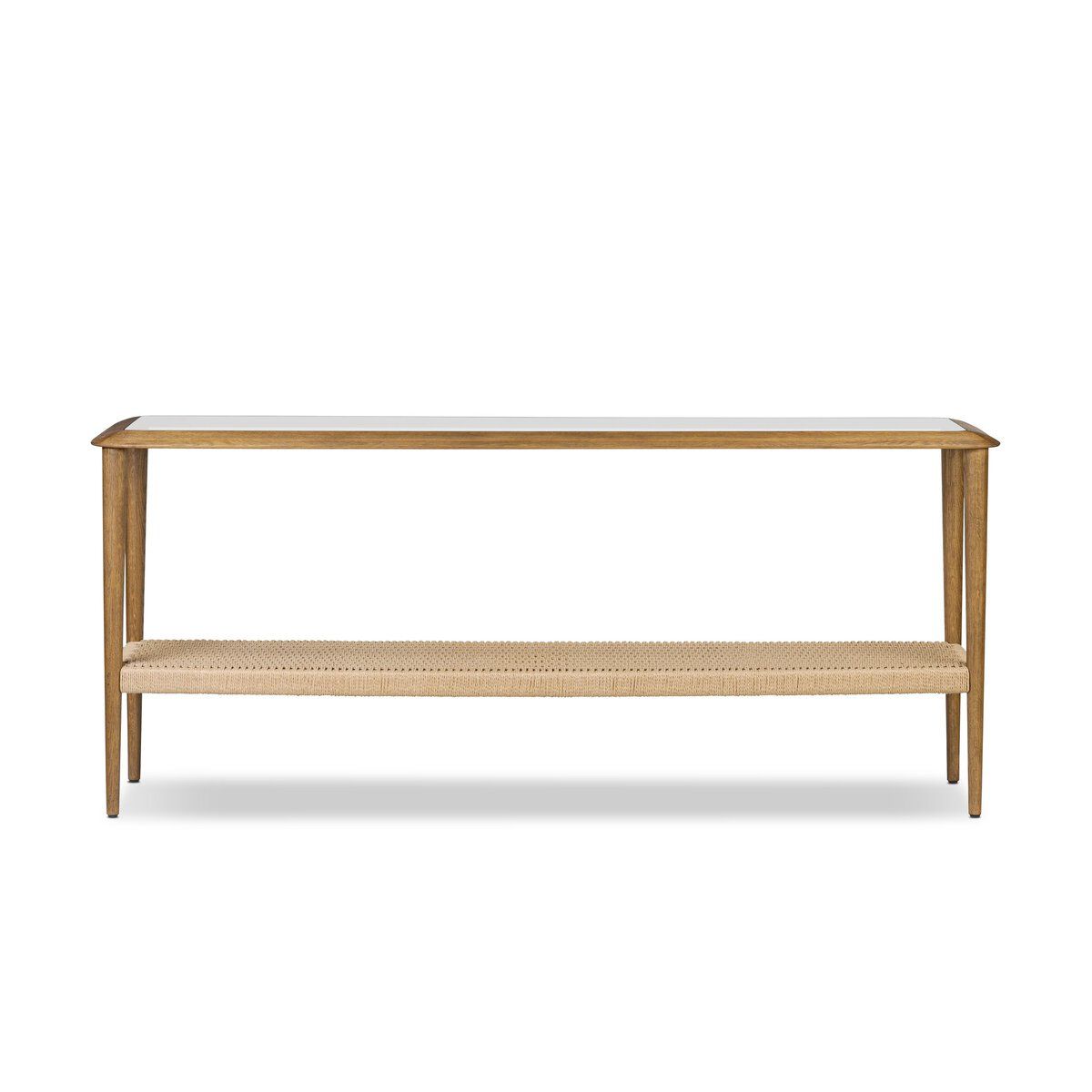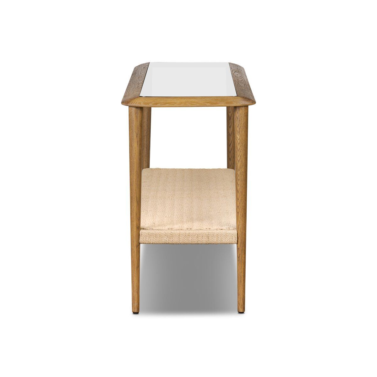 The Four Hands Carmelo Console Table brings a light, architectural presence to interiors with its open, versatile design. Crafted from brown oak and woven paper cord, the silhouette feels balanced and intentional, allowing the table to integrate seamlessly into a range of spaces and styles. A clear tempered glass top adds visual openness while showcasing the materials beneath.