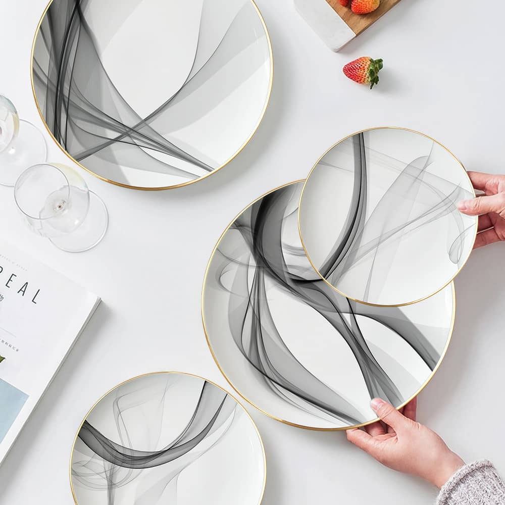 Crafted from high-quality porcelain, fine bone china, this dinner set features a stunning marble design that mimics the natural patterns and textures found in real marble. The classic and timeless color combination of white and grey makes it a versatile choice that can complement any decor style, from modern to traditional.