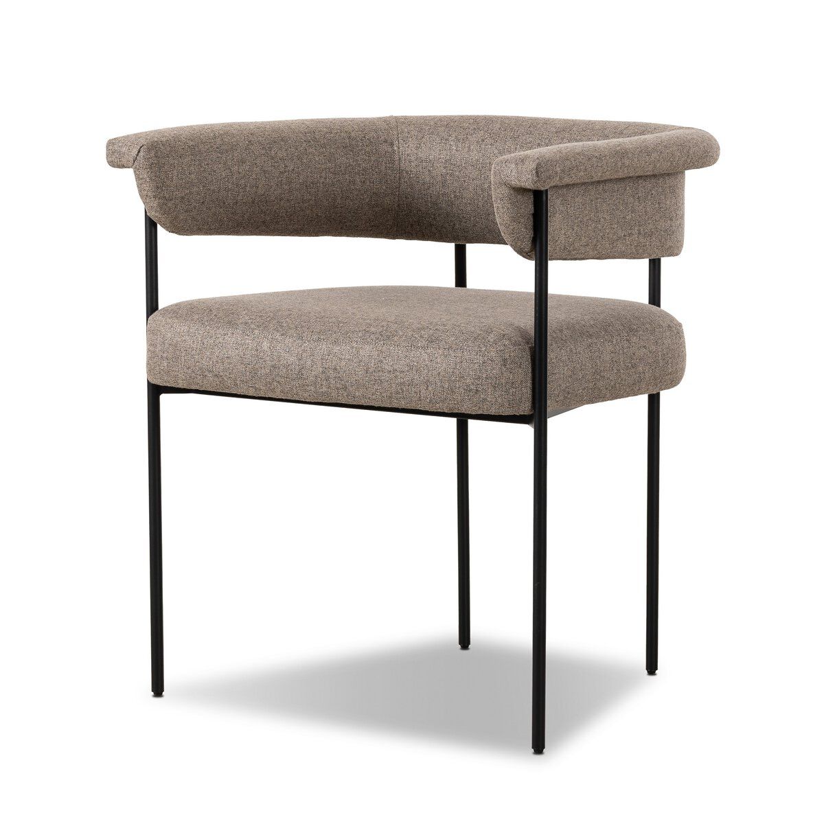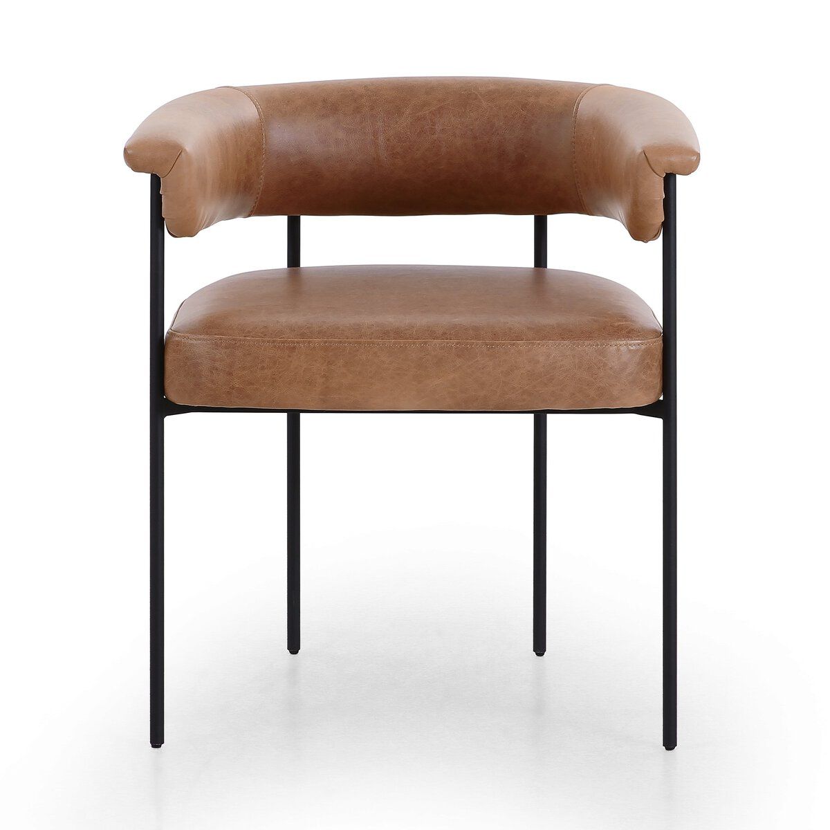 Airy and sculptural, the Carrie Dining Chair by Four Hands brings a refined lightness to modern dining spaces. Slim iron framing in a black finish creates a striking, architectural profile, while camel-colored upholstery adds warmth and tactile contrast. The silhouette is elevated by a distinctive yoke back, offering visual interest from every angle.