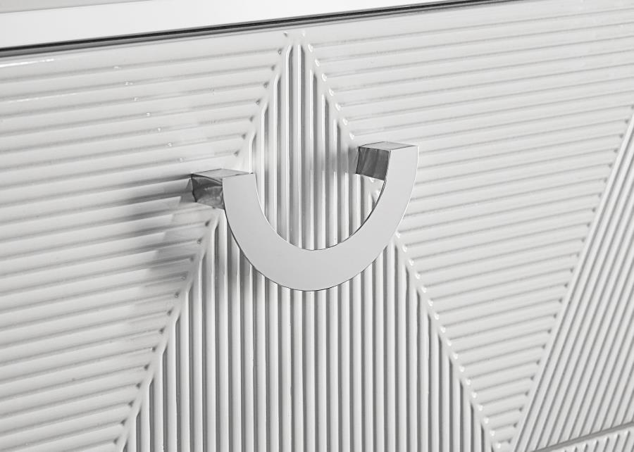 With a sleek high gloss finish and sculptural texture, this five-drawer chest makes a striking addition to the modern bedroom. Its geometric drawer fronts feature ribbed V-patterns that shift across each tier, accented by polished chrome U-shaped pulls. The top drawer is lined in black felt for delicate storage, while all drawers operate smoothly on 45mm ball bearing glides. Elevated on tapered chrome-finished legs, this chest offers elevated storage with sharp visual impact.