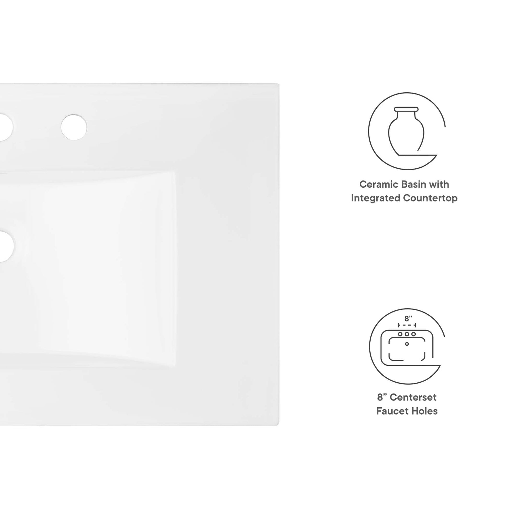 Wash, rinse, and brush in modern style with the Cayman 30" Sink. This ceramic sink boasts 8-inch widespread faucet holes, an integrated countertop, and a rectangular basin design, all coming together to create a modern and sophisticated look for your bathroom space. Elevate your daily routine with this contemporary sink that combines functionality and aesthetic appeal flawlessly.