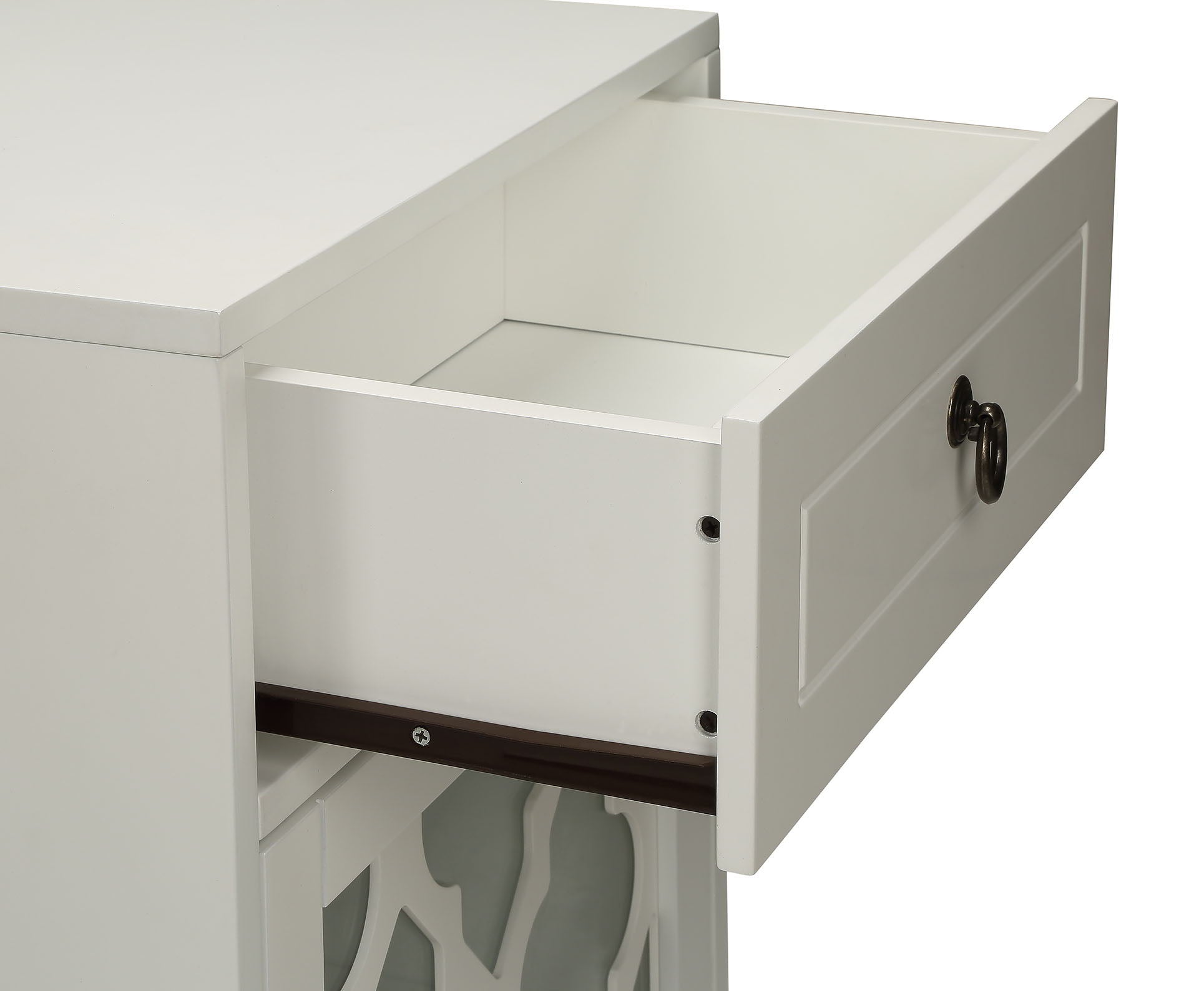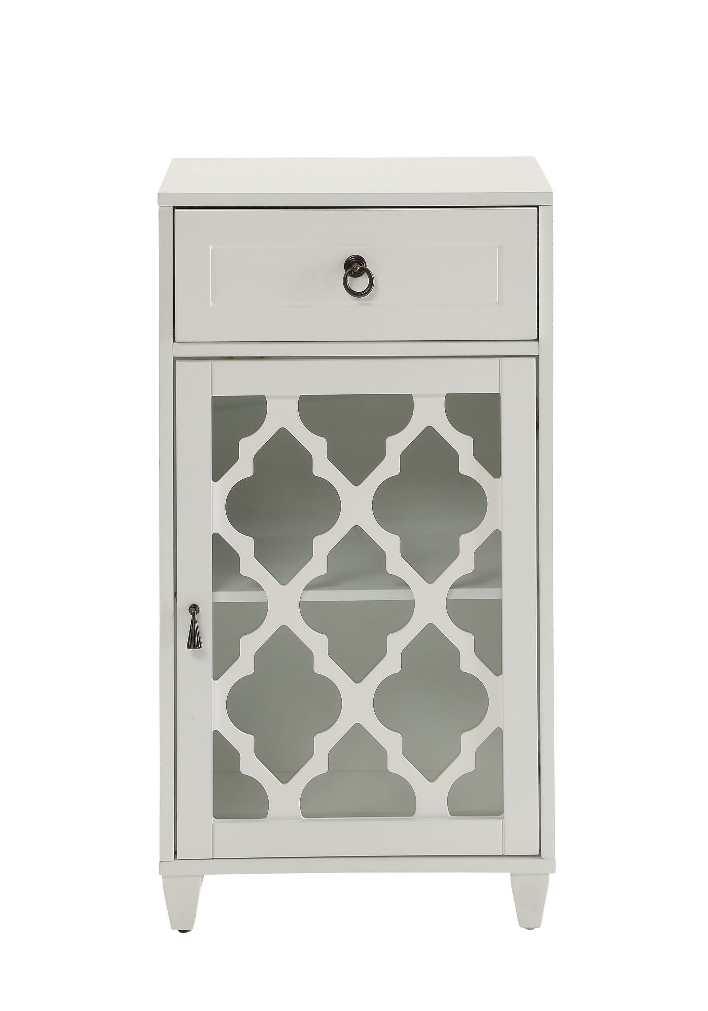 - Versatile Design: The Ceara White Finish Accent Table features a compact design with one drawer and a glass door, making it a stylish and functional addition to any space.