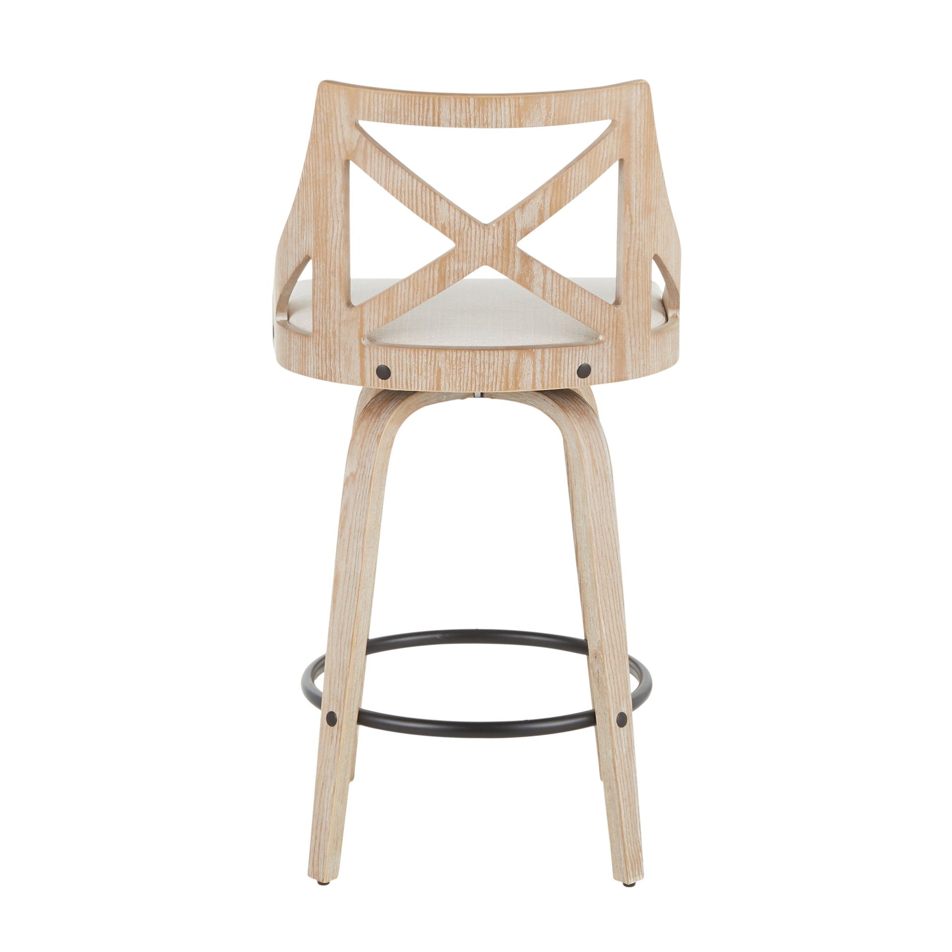 - Stylish Design: The Charlotte Counter Stool enhances any dining area with its elegant design, featuring a distinctive X-shaped accent on the backrest. Its white washed wood and fabric upholstery blend seamlessly to offer a transitional look that complements both traditional and farmhouse styles.