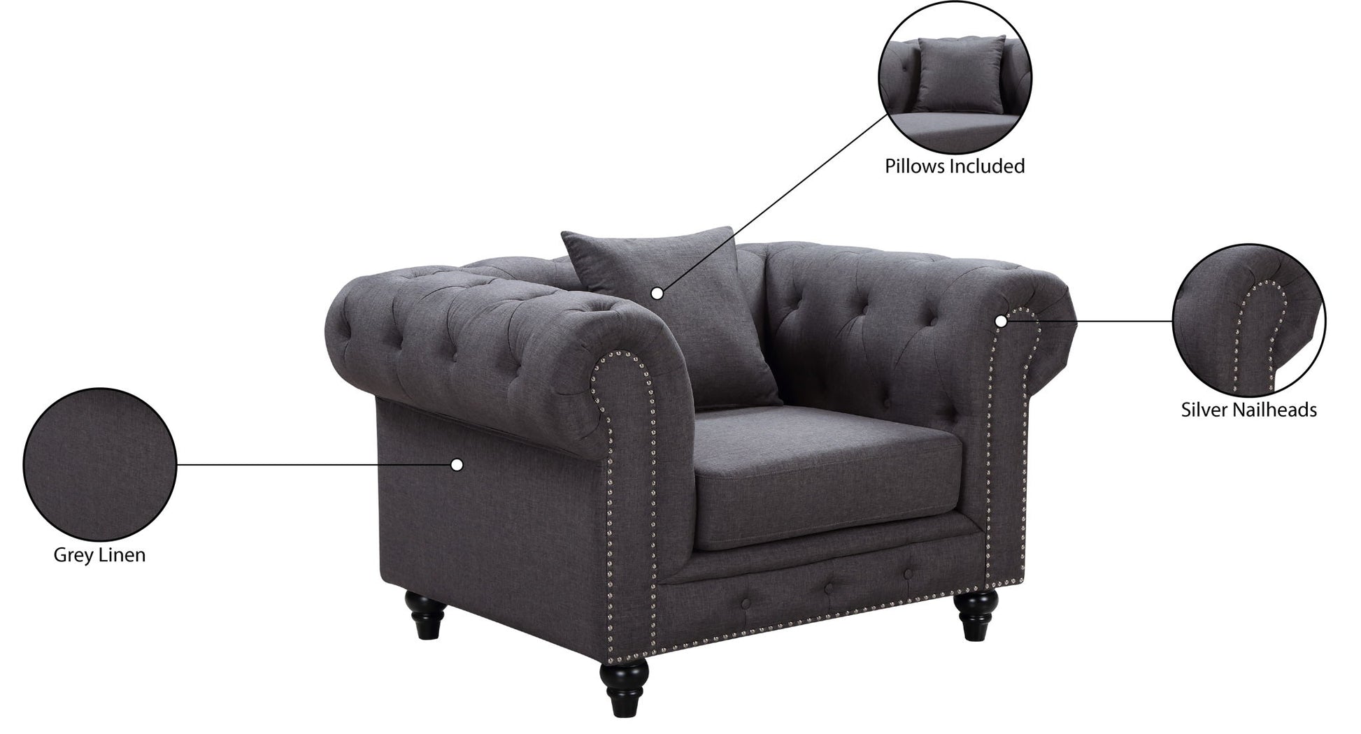 Elegant and eye-catching, the stunning Chesterfield Living Room from Meridian Furniture is the perfect addition to any space. covers the plush, comfortable seat, padded with high-density foam and modern tufted design. Strength and beauty is guaranteed with a solid wood frame and legs. Features a nail head design on the arms and includes matching throw pillows.