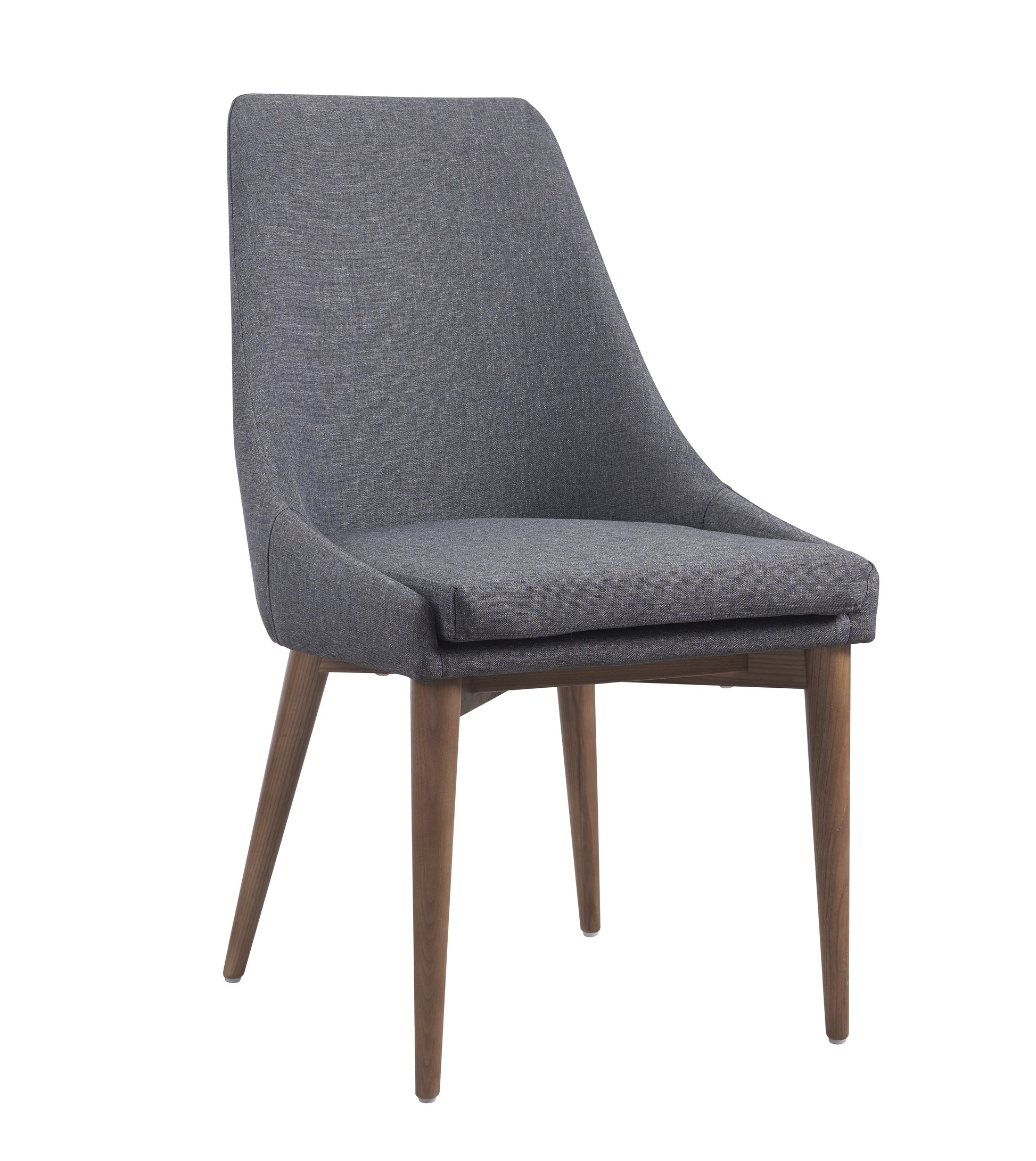 Complementing the sleek upholstery are beautifully sculpted walnut legs, adding warmth and an elevated contemporary aesthetic. The rich wood tone contrasts elegantly with the grey fabric, giving the chair a balanced and stylish appearance that pairs perfectly with the matching Class Extension Dining Table.