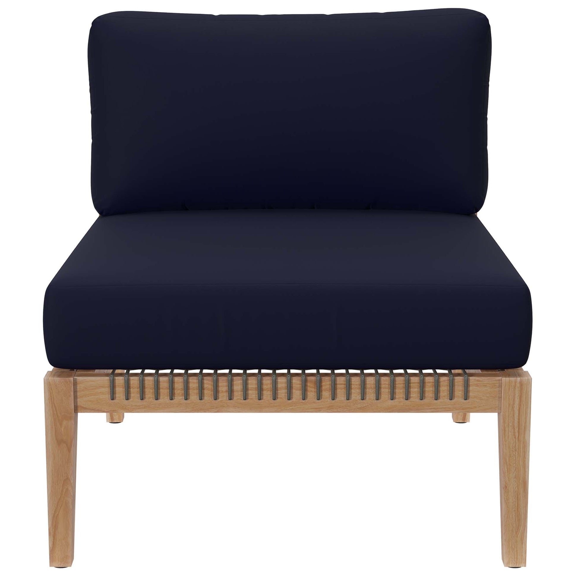 Bask in warm weather as you lounge on the Clearwater Outdoor Patio Furniture Collection. Bringing contemporary aesthetics to a backyard, porch, patio, deck, or poolside, this outdoor armless chair features woven rope webbing underneath the foam padded cushions that grants breezy, coastal charm. Rest and relax amidst comfortable cushions with removable all-weather covers for easy cleaning. The base of this patio armless chair is crafted with grade A premium teak wood that boasts a beautiful, rich wood grain and is naturally weather-resistant. Includes non-marking foot glides to protect flooring. Weight Capacity: 498 lbs.