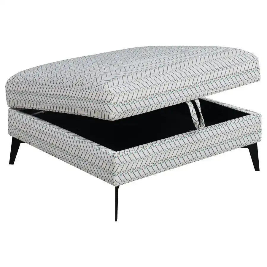 Function and fashion mix with a delightful result in this modern storage ottoman. Brighten a sofa set or sectional with a square ottoman adding plenty of surface and storage space. Covered in fabric with a compelling geometric design, its gray-centered palette blends with a mix of pieces in a living room or bedroom. A fully enchased engineered wood frame with stylish black metal legs and a black lined interior adds a tasteful angle, while a looped handle easily lifts its upholstered top. Use this storage ottoman as a footrest or for extra seating.