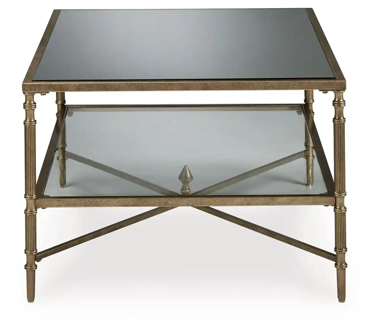 The Cloverty coffee table gives traditional design a wonderful sense of relevance. Its details, which include embellished legs and a stretcher with a decorative center finial, are timeless classics. The aged goldtone coloration is the essence of relaxed elegance. An underlying shelf adds style, substance and functionality.